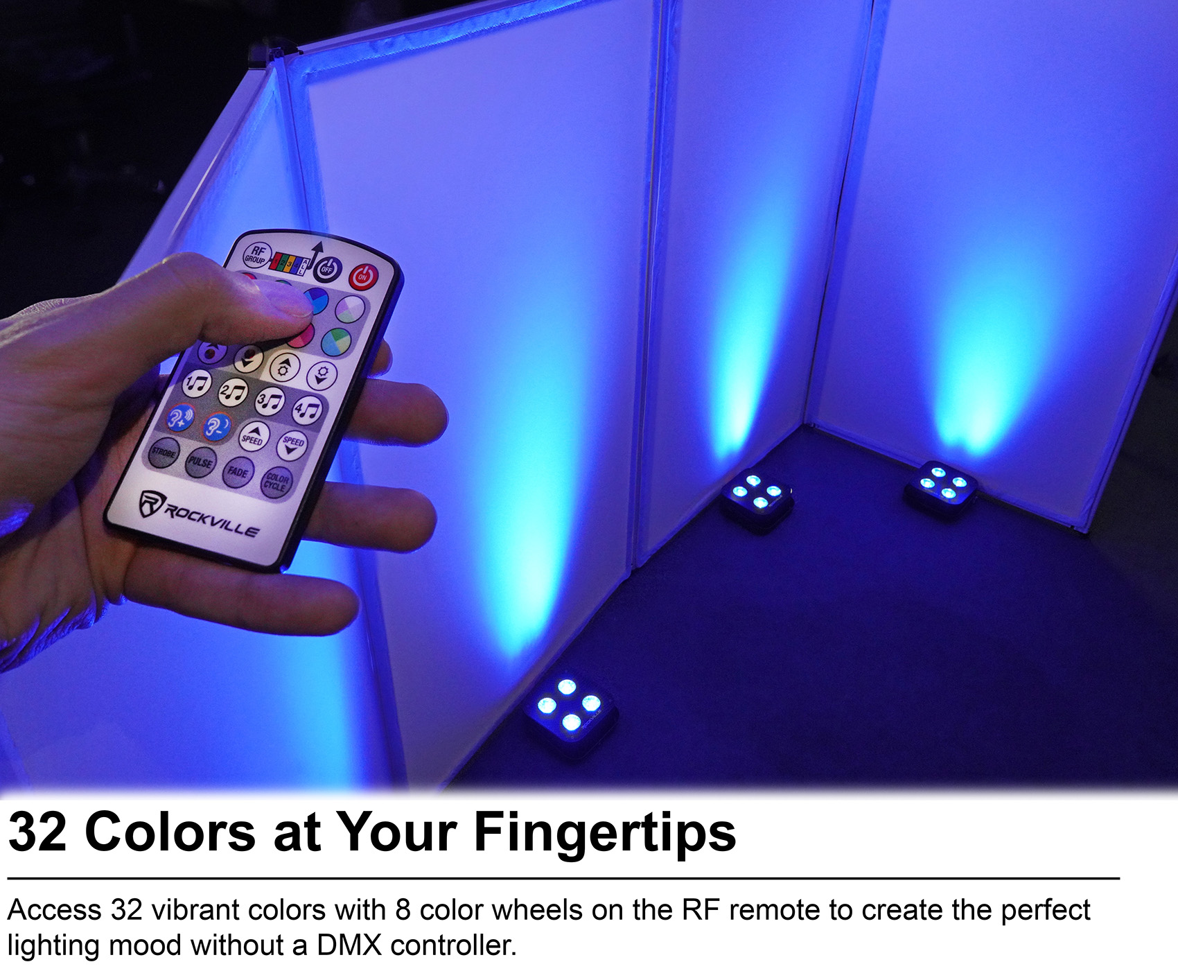 The remote also has 8 color wheels on it. Each color wheel contains 4 colors. Once you select one of those color wheels you can use the up and down arrows to browse other colors in that color wheel. You can also adjust the brightness of any color from the remote. So from the remote you have access to 32 colors without any DMX controller! Combine this with all the RF channels and master/slave groups and you will likely not need any DMX controller!