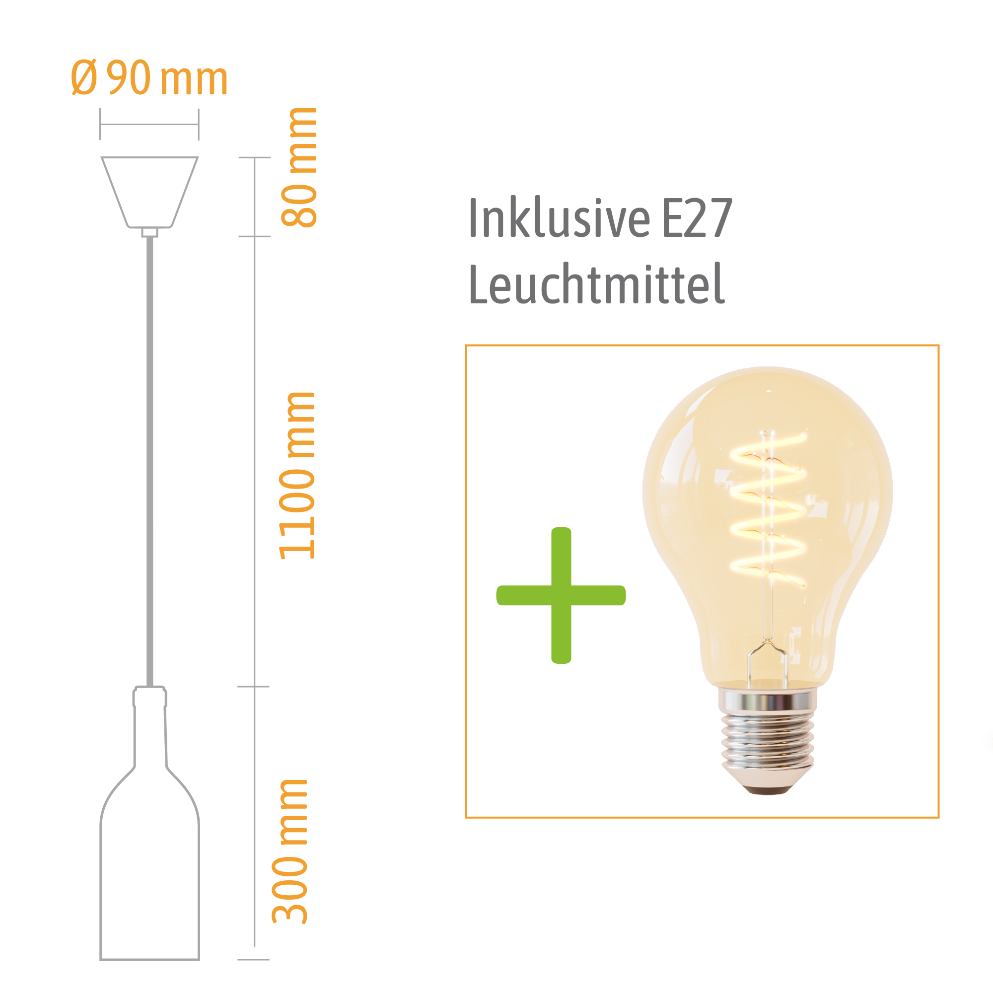 Im Lieferumfang enthalten ist eine Retro Filament LED Glühbirne (E27), die den nostalgischen Charme der Pendelleuchte perfekt abrundet. Sie erzeugt ein warmes, angenehmes Licht und verbindet modernste Technik mit einem Hauch von Retro. Erschaffe eine extra gemütliche Lichtstimmung.