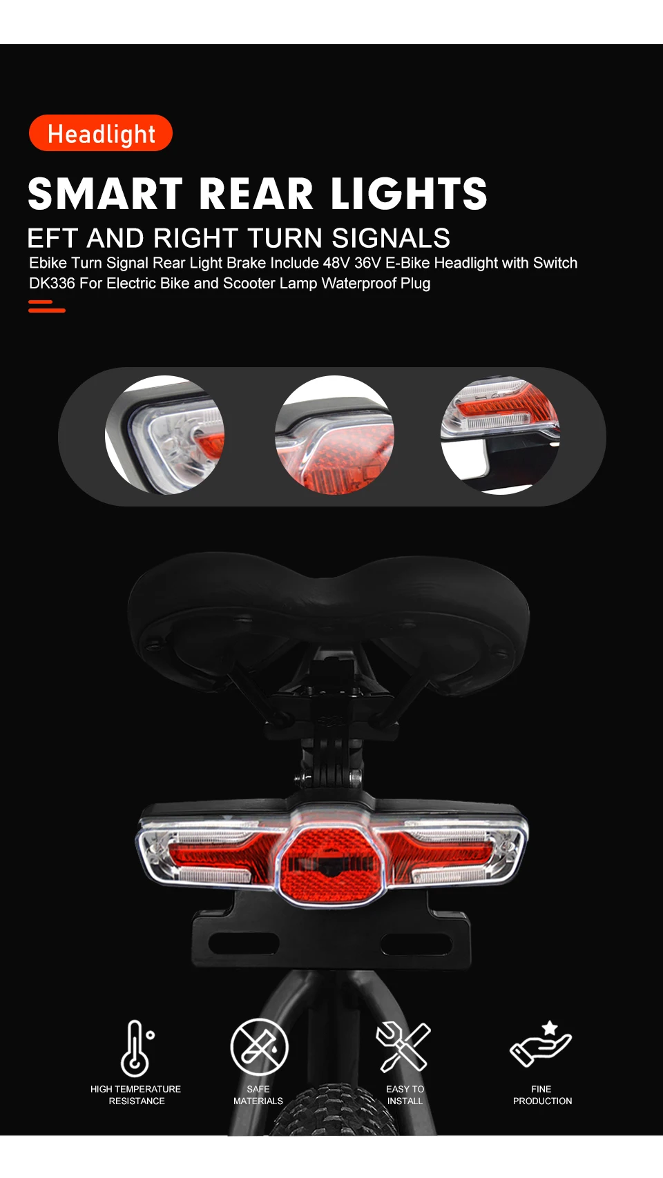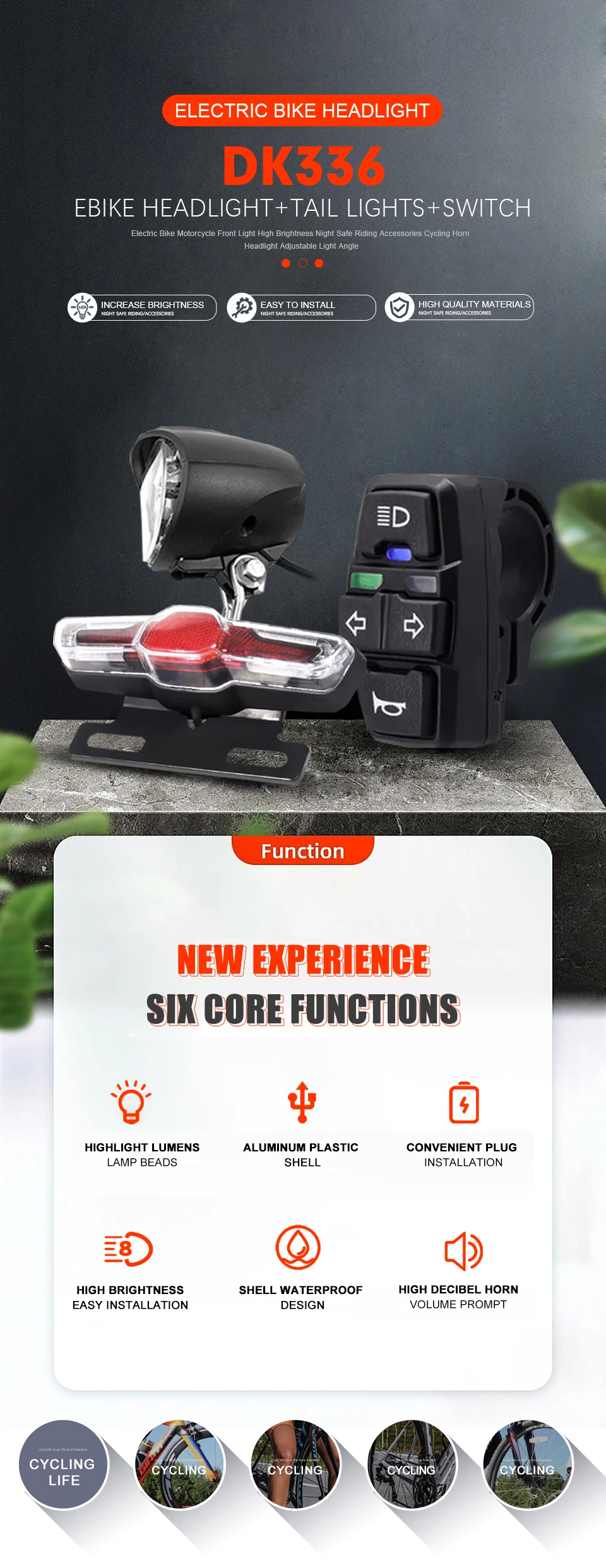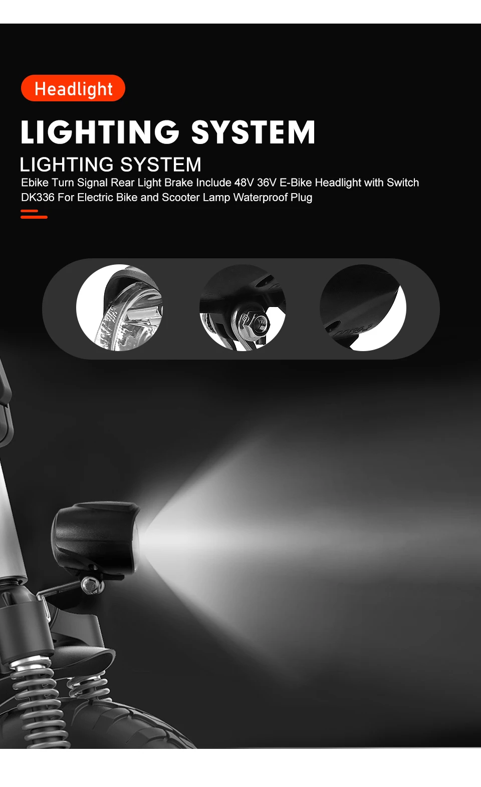 ●36V48V Ebike Headlight+Horn Tail Rear Light LED Electric Bicycle With Switch