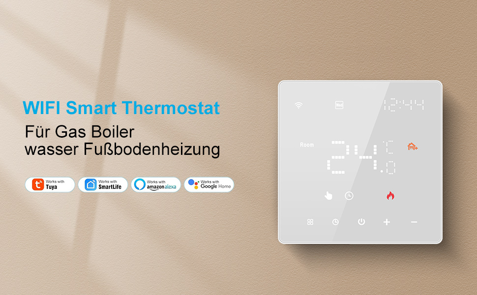 - Intelligente Temperatursteuerung: Das Smart Thermostat bietet präzise Raumtemperaturkontrolle dank des NTC-Temperatursensors. Die Steuerung erfolgt in einem Bereich von 5 bis 70°C, mit einer Anzeigegenauigkeit von ±0,5°C, um stets ein angenehmes Raumklima zu gewährleisten.
