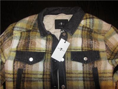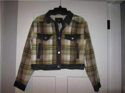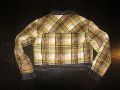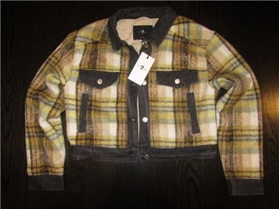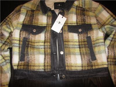 Stylish jacket: faux fur plaid print with denim trim, silver buttons, 4 pockets