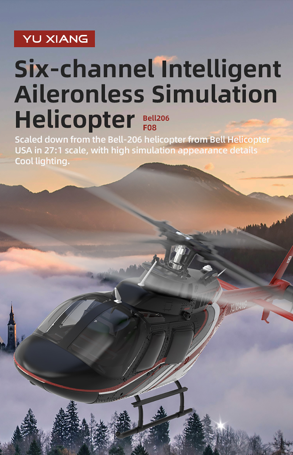 F08 Six-channel Intelligent Aileronless Simulation Helicopter, Scaled down from the Bell-206 helicopter from Bell Helicopter USA in 27:1 scale, with high simulation appearance detailsCool lighting.