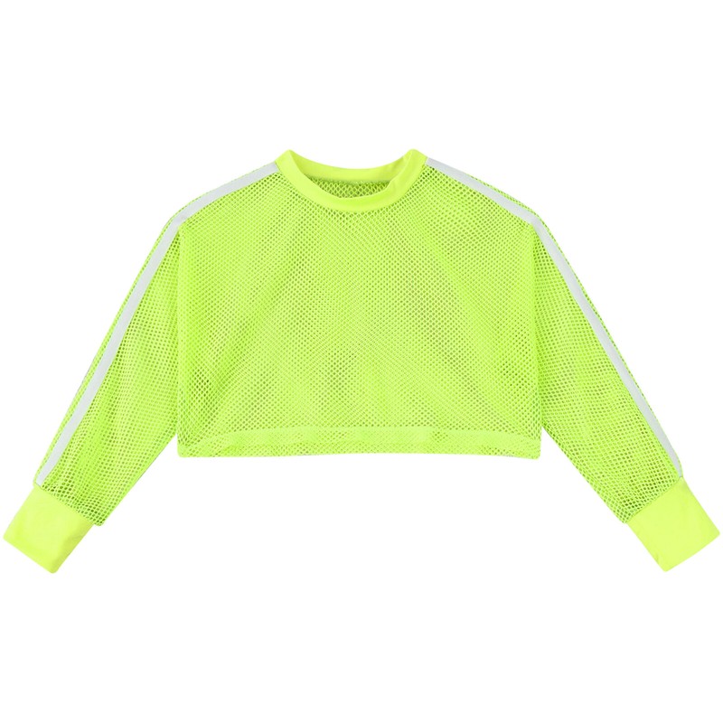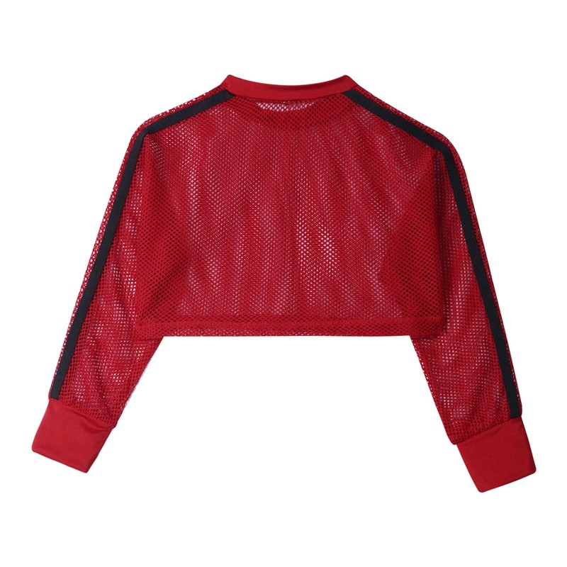 Long sleeve, round neckline crop top is designed with patchwork cuffs.
