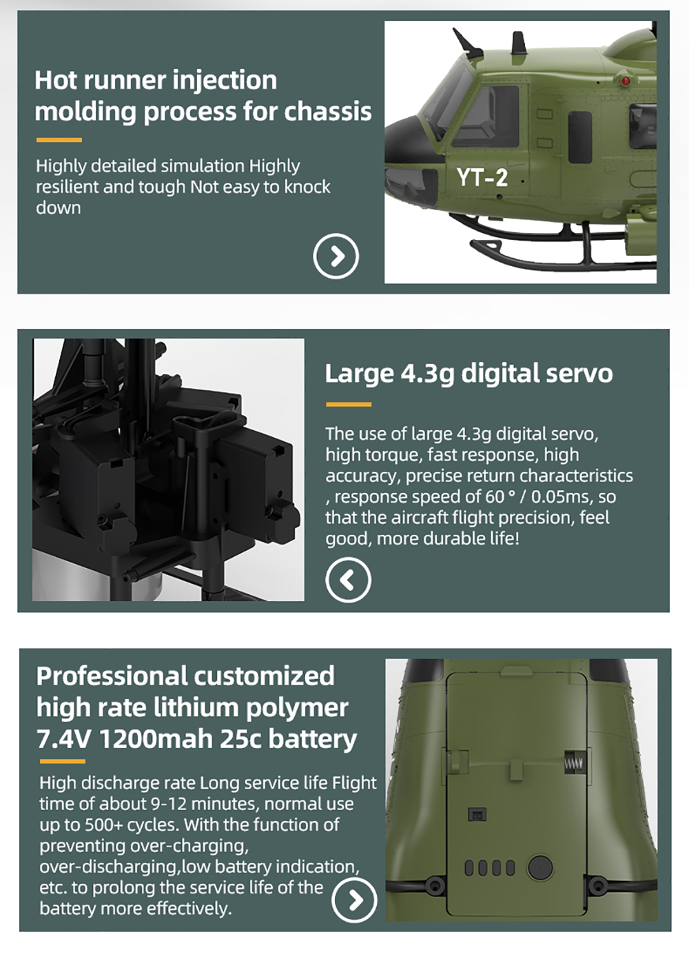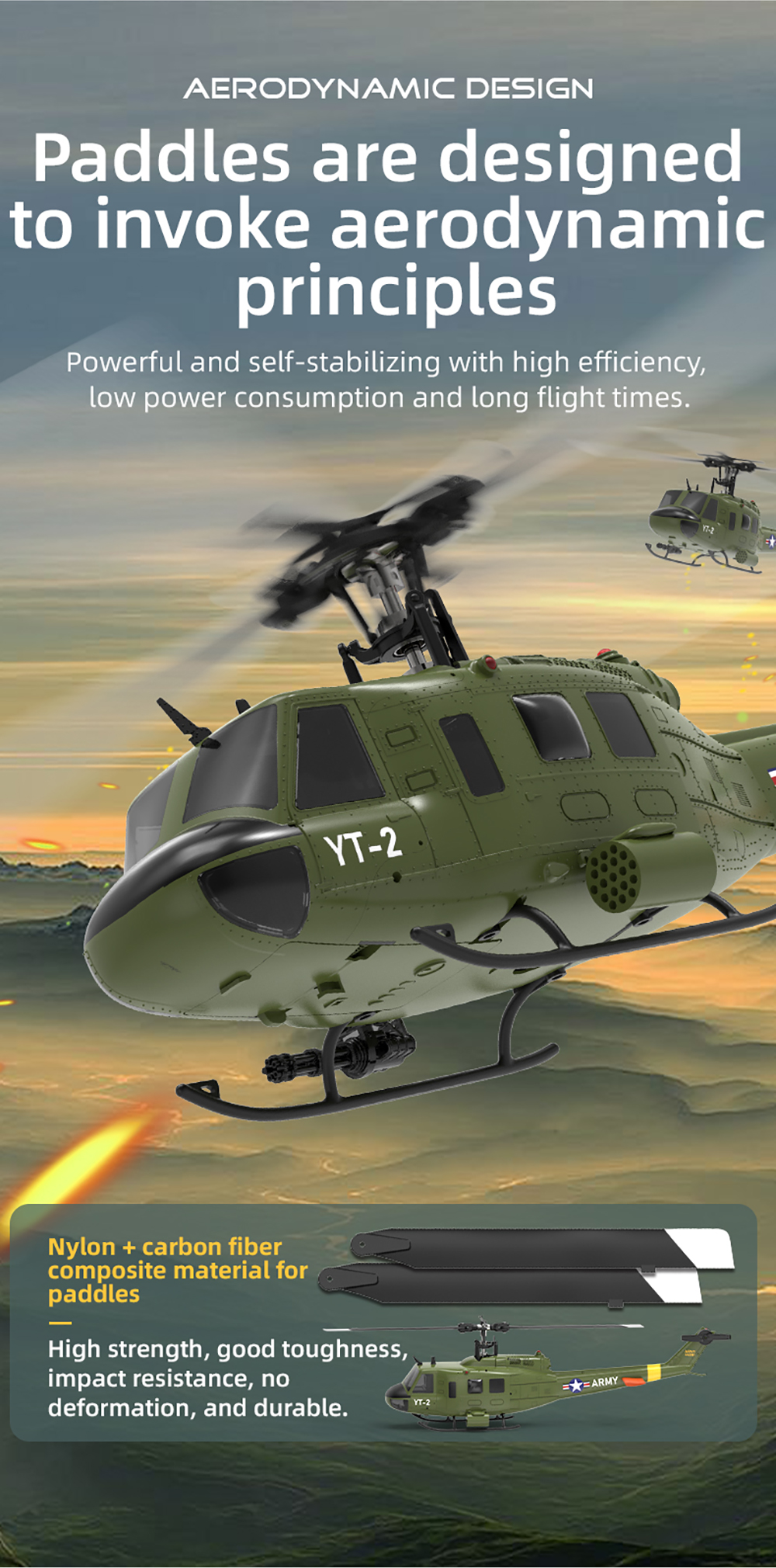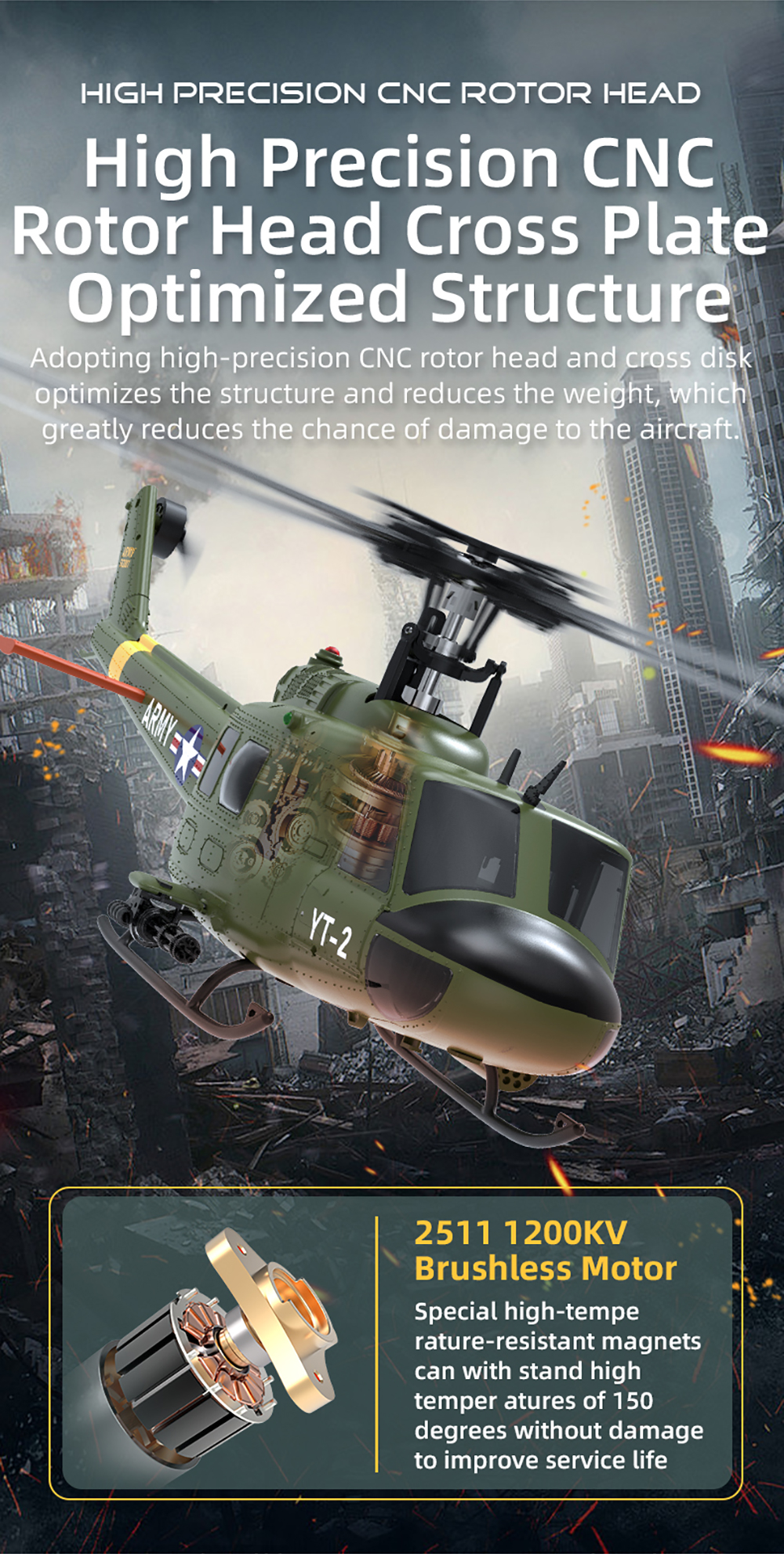 1. Scaled down according to the UH-1 Huey helicopter of American Bell Helicopter Company 34:1 ratio, with high simulation appearance details Cool lighting.