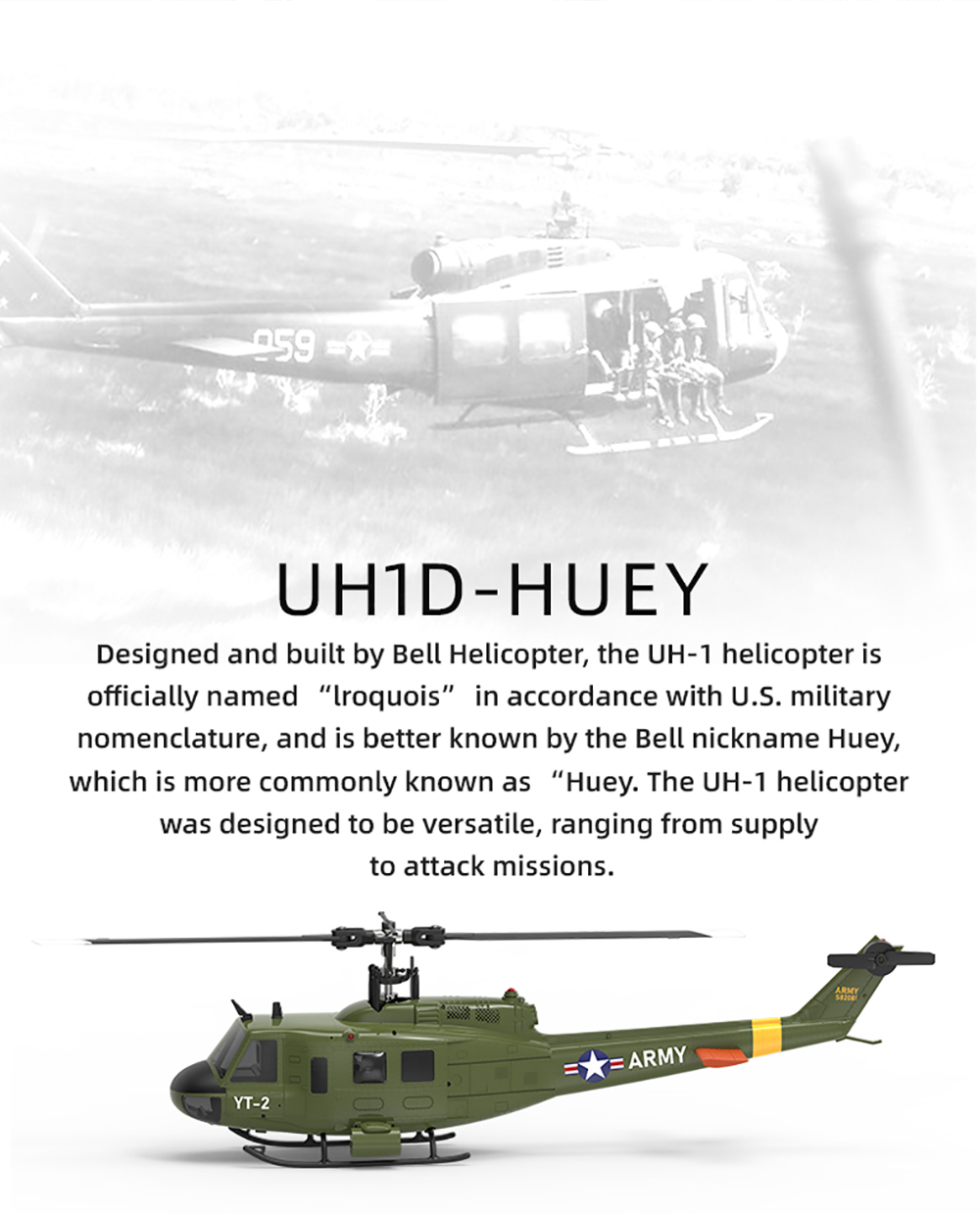 UH1D-HUEY:Designed and built by Bell Helicopter, the UH-1 helicopter is officially named "lroquois" in accordance with U.S. military nomen clature, and is better known by the Bell nickname Huey,which is more commonly known as "Huey. The UH-1 helicopter was designed to be versatile, ranging from supply
