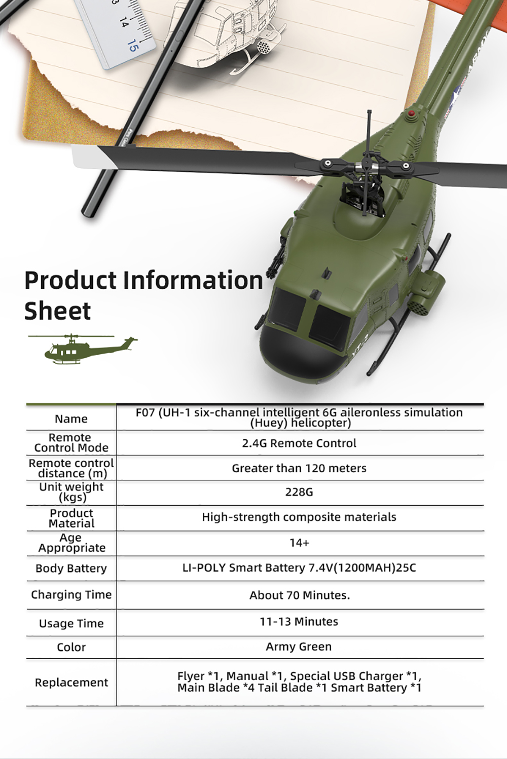Name: F07(UH-1 six-channel intelligent 6G ajleronless simulation(Huey)helicopter)