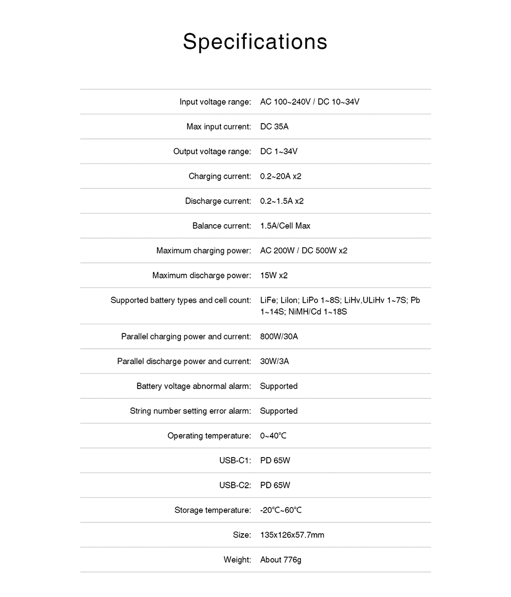 Max Discharge Power:15Wx2;Pb 1~14S; NiMH/Cd 1~18S