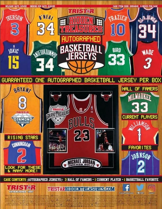 Guaranteed 1 Autographed Basketball Jersey Per BoxLook for the Grand Treasure: Michael Jordan Framed Autographed JerseyLook For These and Many More!Allen IversonShaquille O'NealWalt FrazierHakeem OlajuwonNikola JokicGiannis AntetokounmpoLarry BirdDwyane WadeKobe BryantCade CunninghamKareem Abdul-JabbarZion WilliamsonLarry Johnson