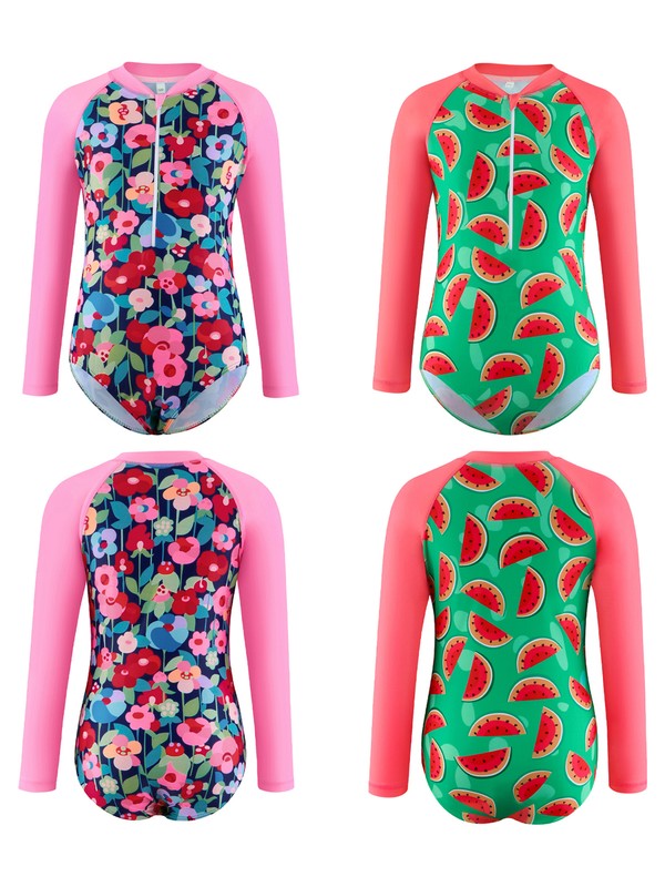 2Pcs Kids Girls Fish Scales Print Round Neck Long Sleeves Cartoon Horse Print Tops and Briefs Swimwear.