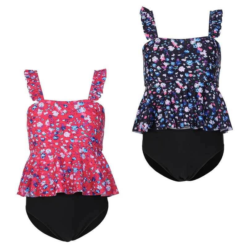 Floral print, round neck, short sleeves, elastic waist, drawstring closure, UPF 50+ sun protection.