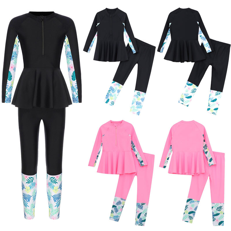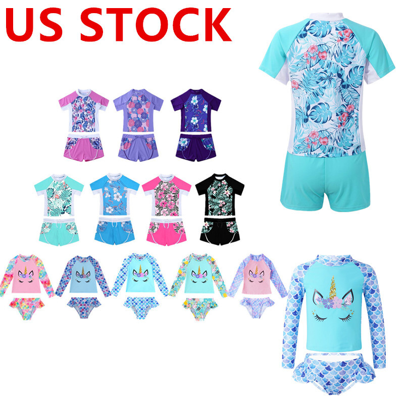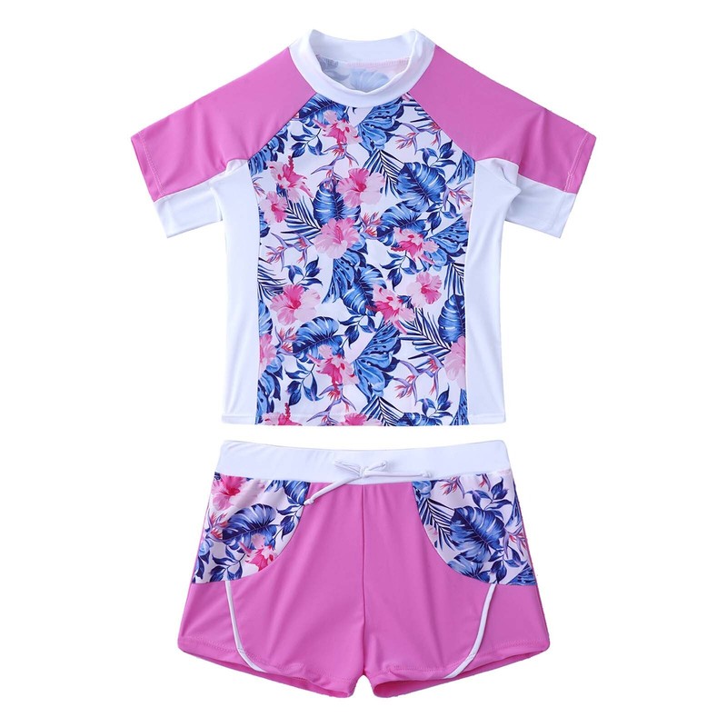 2Pcs Kids Girls Short Sleeves Print Top and Elastic Waist Shorts Swimwear.