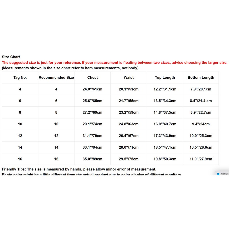 | Tag No. | Recommended Size | Chest | Waist | Tops Length | Bottoms Length |