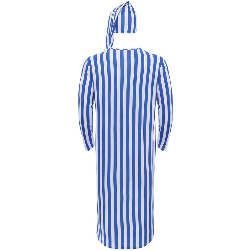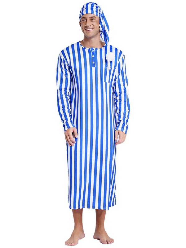 2-piece set includes long robe and hat. Striped robe is designed with long sleeve, crew neck and buttoned placket, pullover style.