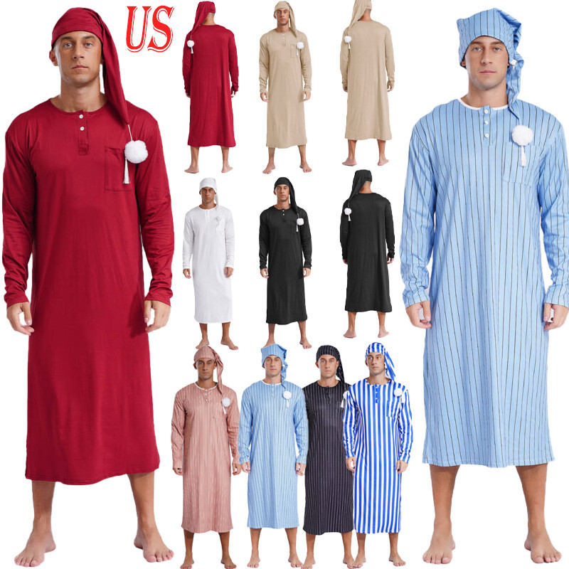 2-piece set includes long robe and hat. The robe is designed with long sleeve, round neck with buttons, pullover style.