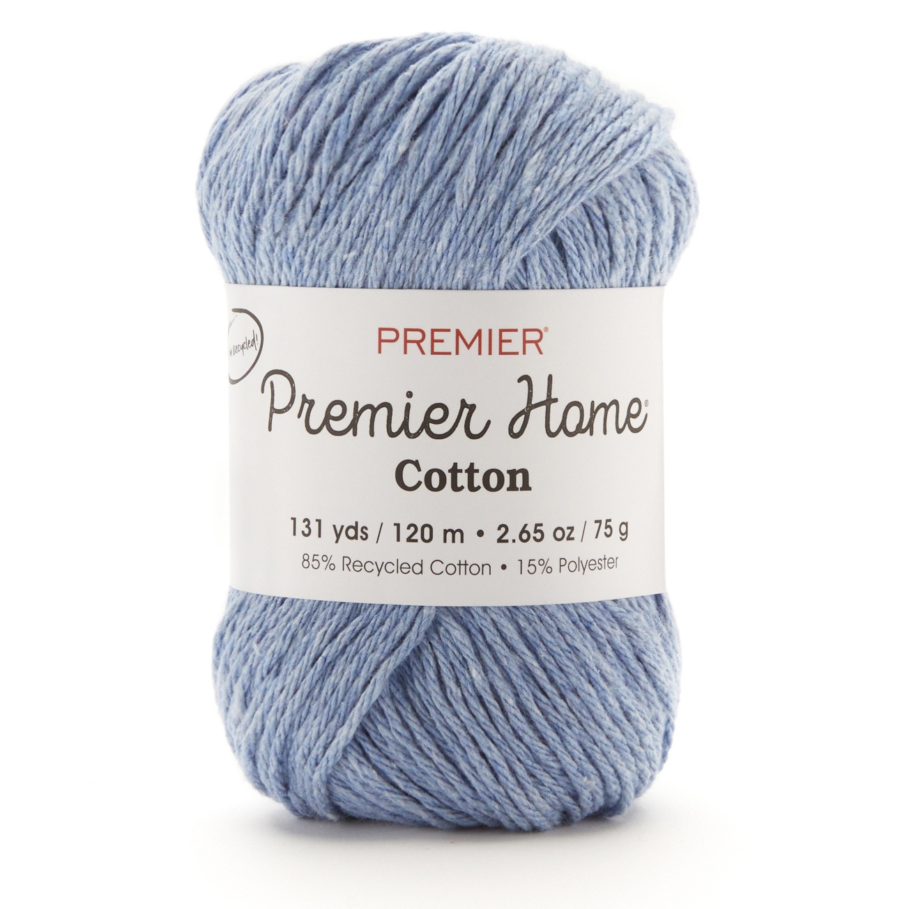 PREMIER YARN-Home Cotton Yarn. This medium weight cotton blended with polyester means colors stay brighter longer, finished projects dry faster and projects are more durable to last longer! Perfect for mesh wash cloths and more! Weight Category: 4. Content: 85% cotton, 15% polyester. Putup: 2.8oz/80g, 140yd/128m. Gauge: 18stx24r = 4in/10cm on size US8/5mm knitting needles. Suggested crochet hook size US1-9/5.5mm. No dyelot. Care: machine wash, dryer safe, do not bleach, do not iron, do not dry clean. Comes in a variety of colors. Imported.