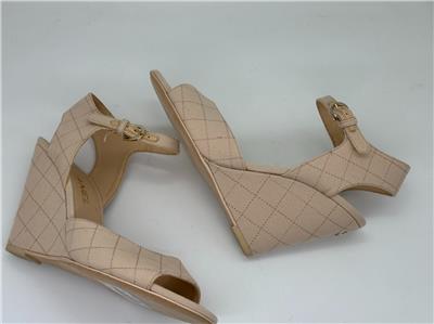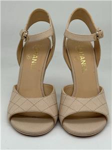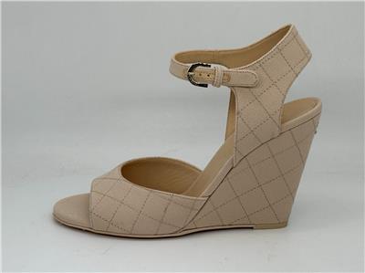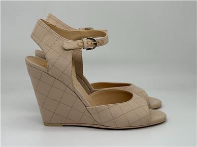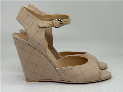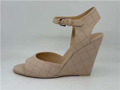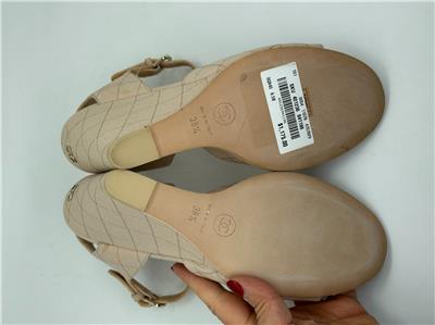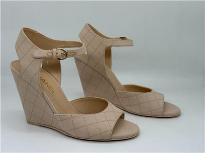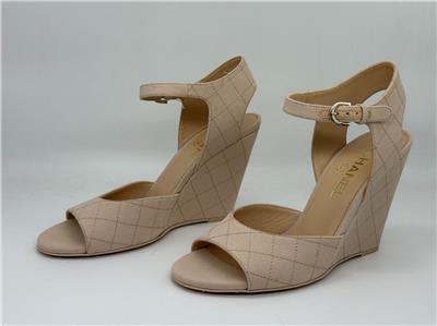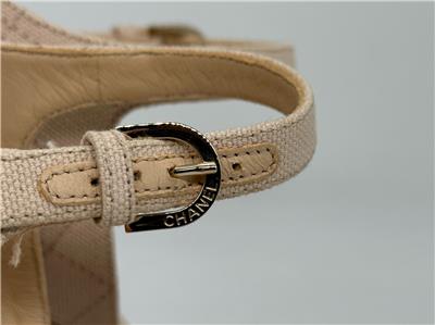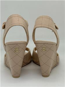 Beige fabric open toe sandals. 4" wedge heel. Goldtone CC logo on the bak. Ankle strap with goldtone Chanel engraved buckle. Padded leather insole. Leather sole. Made in Italy. Designer color: Beige.