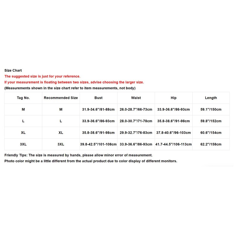 | Tag No. | Recommended Size | Bust | Waist | Hip | Length |