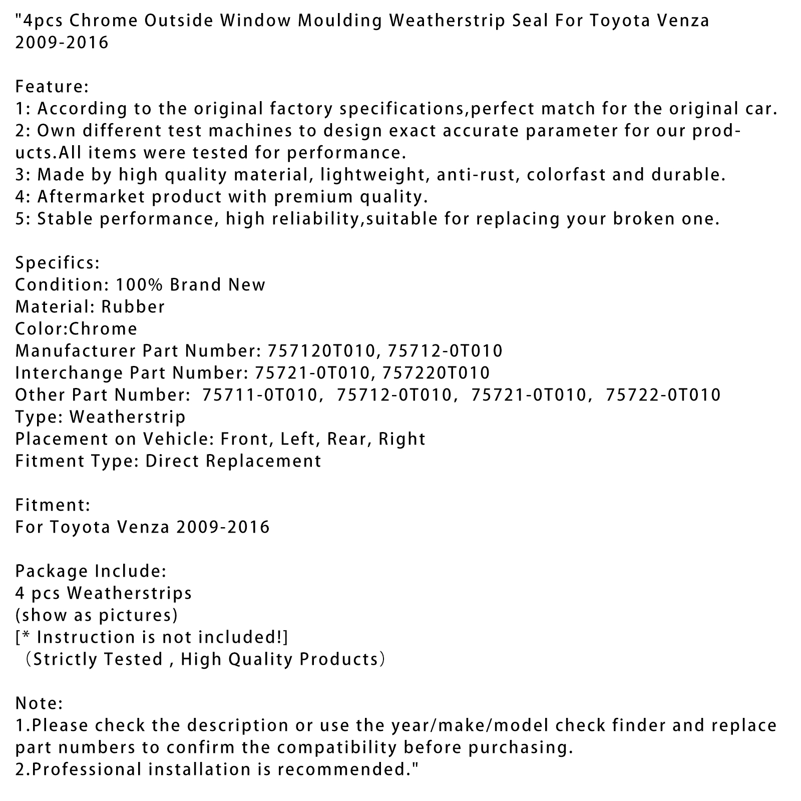 4pcs Chrome Outside Window Moulding Weatherstrip Seal For Toyota Venza 2009-2016