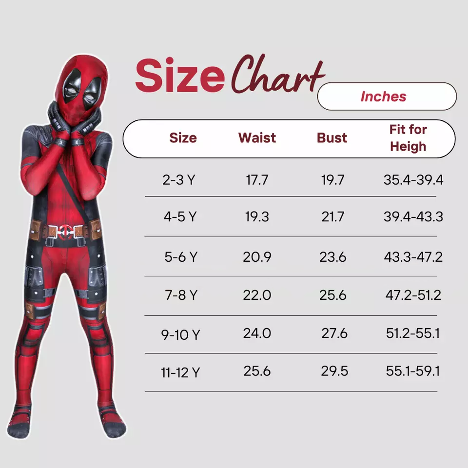 The costume includes a one-piece Deadpool jumpsuit and detachable authentic mask, sword holder and 2x plastic sword to complete the unique look. It's perfect for birthday parties, cosplay events, special photoshoots, Halloween, or as a thoughtful gift for any young Deadpool fan. Suitable for toddlers aged two up to young boys aged twelve, this costume comes in six different sizes to ensure the perfect fit for your child.