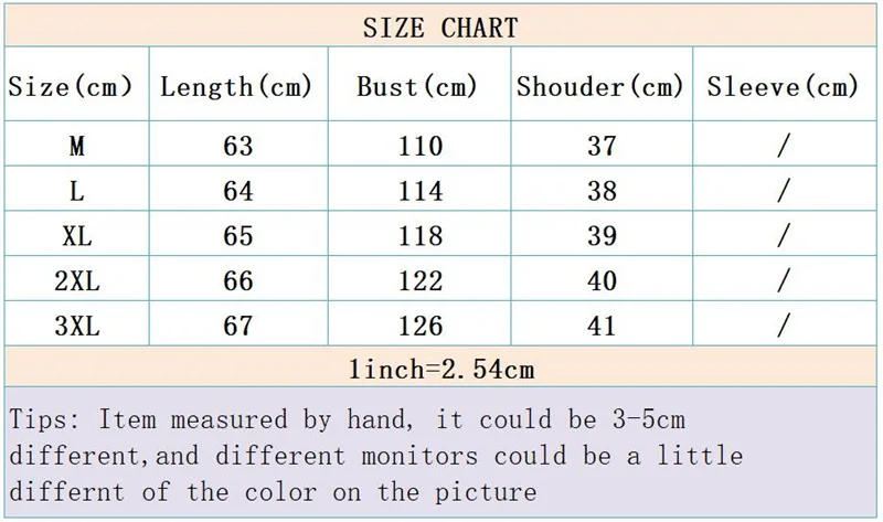 Please note: 1.Please allow a little error due to manual measurement. 2.The color maybe a little difference because of the light,screen reflection etc. 3.If you are not sure what size to choose, you can tell us your height and weight, we will recommend the right size for you.
