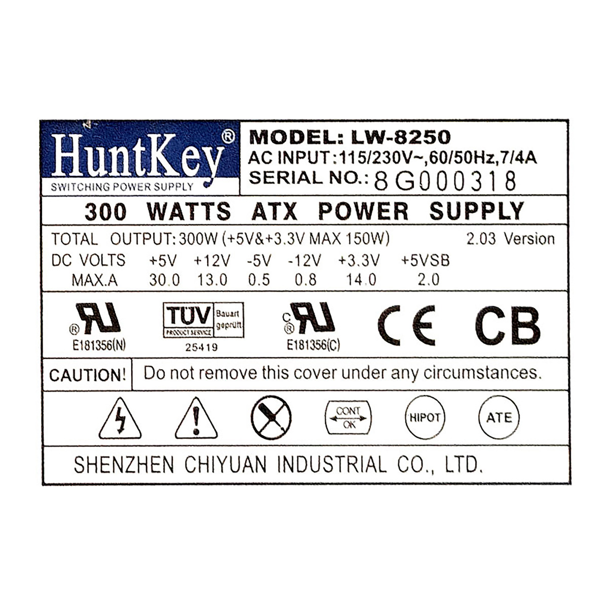 Netzteil HUNTKEY LW-8250 300W ATX 20-PIN MOLEX FDD AUX ATX12V