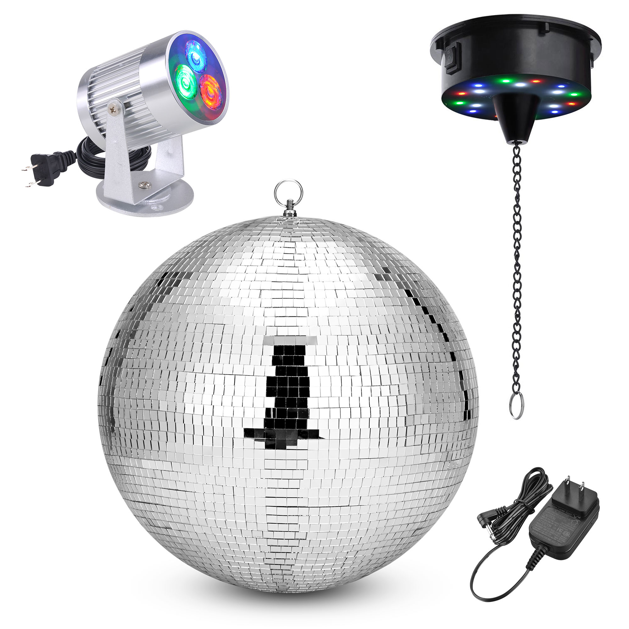 LED Spotlight & Mirror Ball Kit includes LED spotlight, 16" mirror ball and mirror ball rotating motor for creating bright-colored lighting effect, ideal for creating a shiny party atmosphere and giving you amazing light shows.