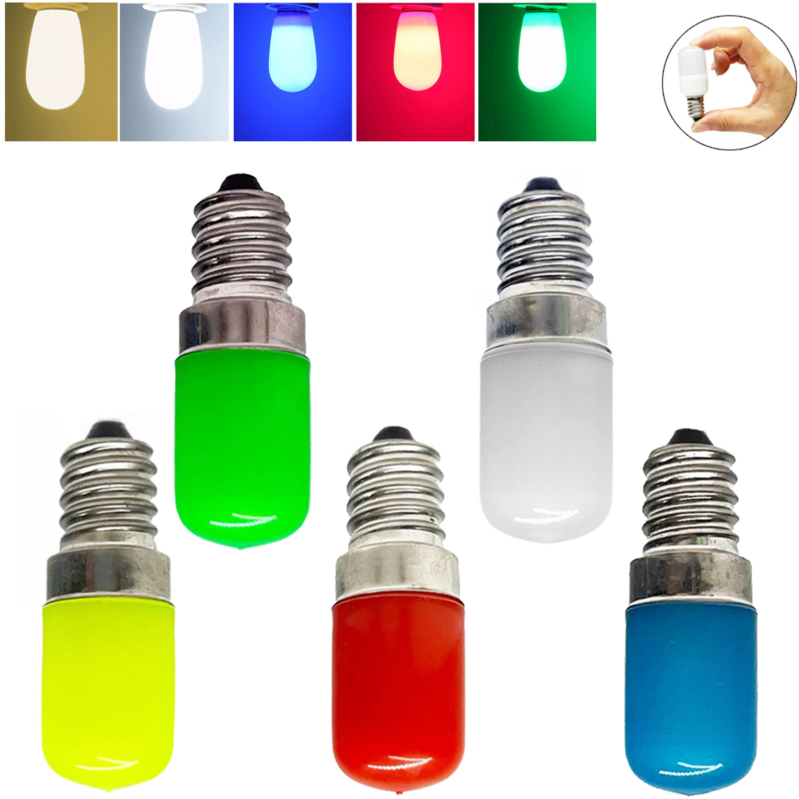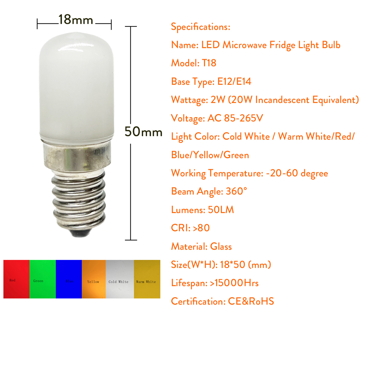 E14 E12 LED-Glühbirnen-Spezifikationen: Name: LED-Glühbirne für Mikrowellen-Kühlschrank Modell: T18 Sockeltyp: E12/E14 Wattzahl: 2 W (Äquivalent zu 20 W Glühlampen) Spannung: Wechselstrom 85–265 V Lichtfarbe: Kühles Weiß / Warmes Weiß / Rot, Blau, Grün, Gelb LED-Chips: 2835 SMD Arbeitstemperatur: -20–60 Grad Abstrahlwinkel: 360° Lumen: 200LM CRI: >80 Material: PC Größe (B*H): 18*50 (mm) Lebensdauer: >15000 Stunden Zertifizierung: CE&RoHS