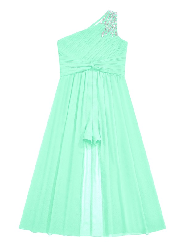 Auf Schulterumfang verstreuen sich exquisite Perlendetails, die Mädchen zu einem Blickfang und Glanz machen. Der geraffte Knoten auf der Vorderseite Taillenumfang sorgt für perfekte Proportionen.