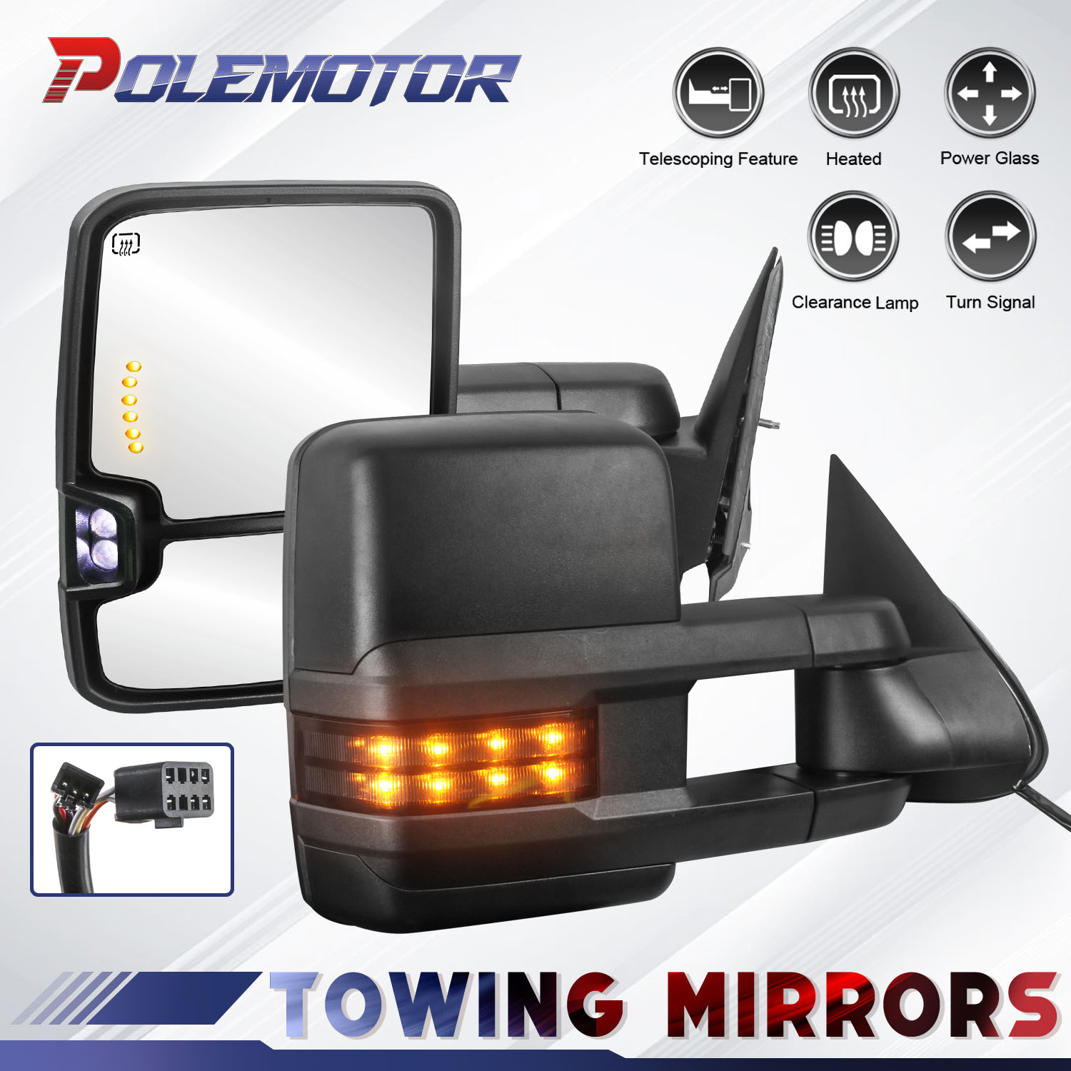 · Power operate adjusted, Heated with turn signal lights,Manual Telescoping & Foldingļ¼ arms,manual filp up,runing lights,clearance lights