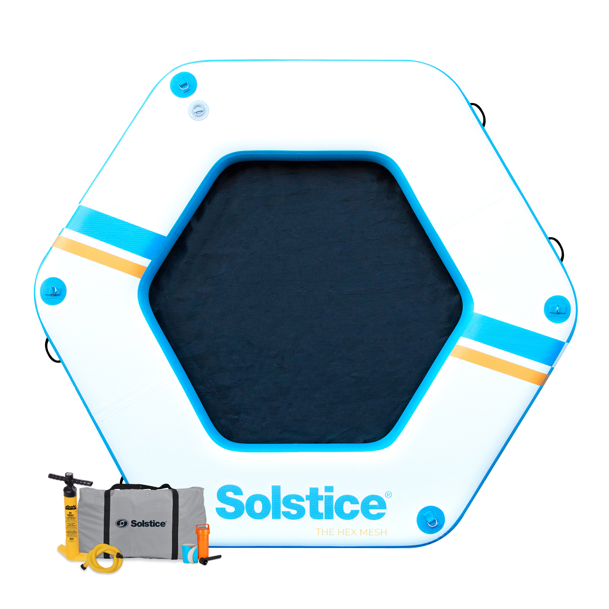 Introducing the SOLSTICE Hexagon Inflatable Mesh Dock Platform—a versatile and spacious floating oasis designed for lakes, pools, and oceans. Measuring 8 by 6 inches, this platform comfortably accommodates 4 to 7 people, making it ideal for family gatherings, friendly hangouts, or a relaxing day with your pet.