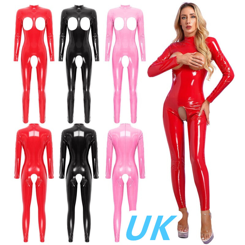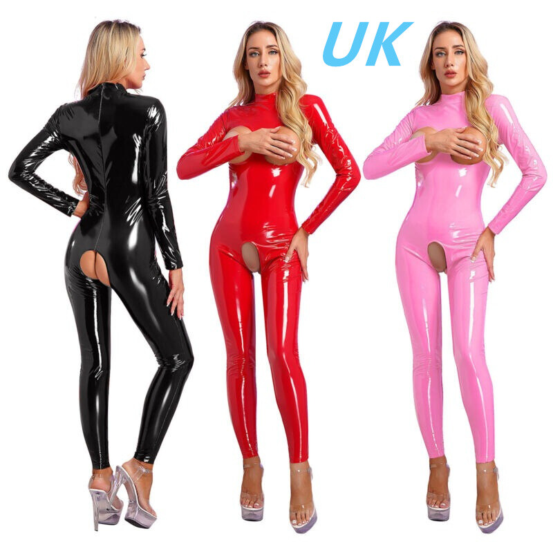 UK Women PVC Leather Crotchless Bodysuit Long Sleeve Mock Neck Jumpsuit Catsuit