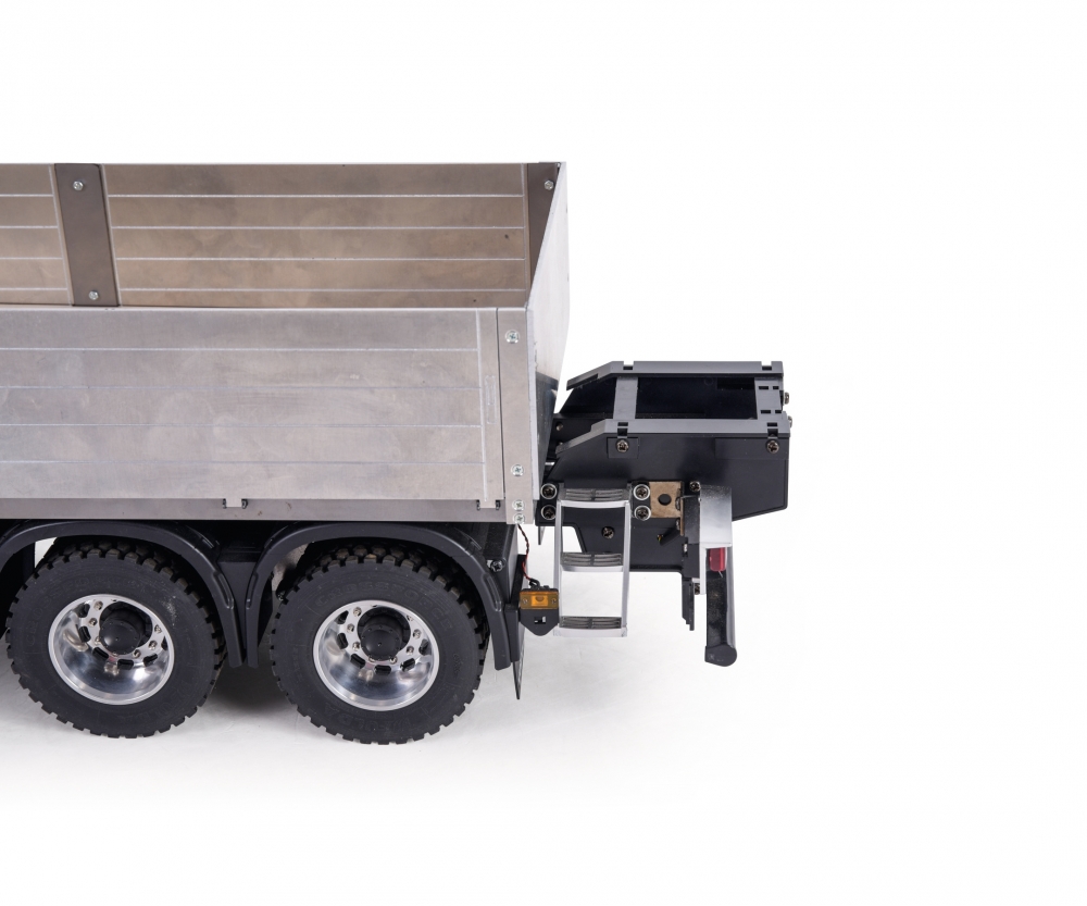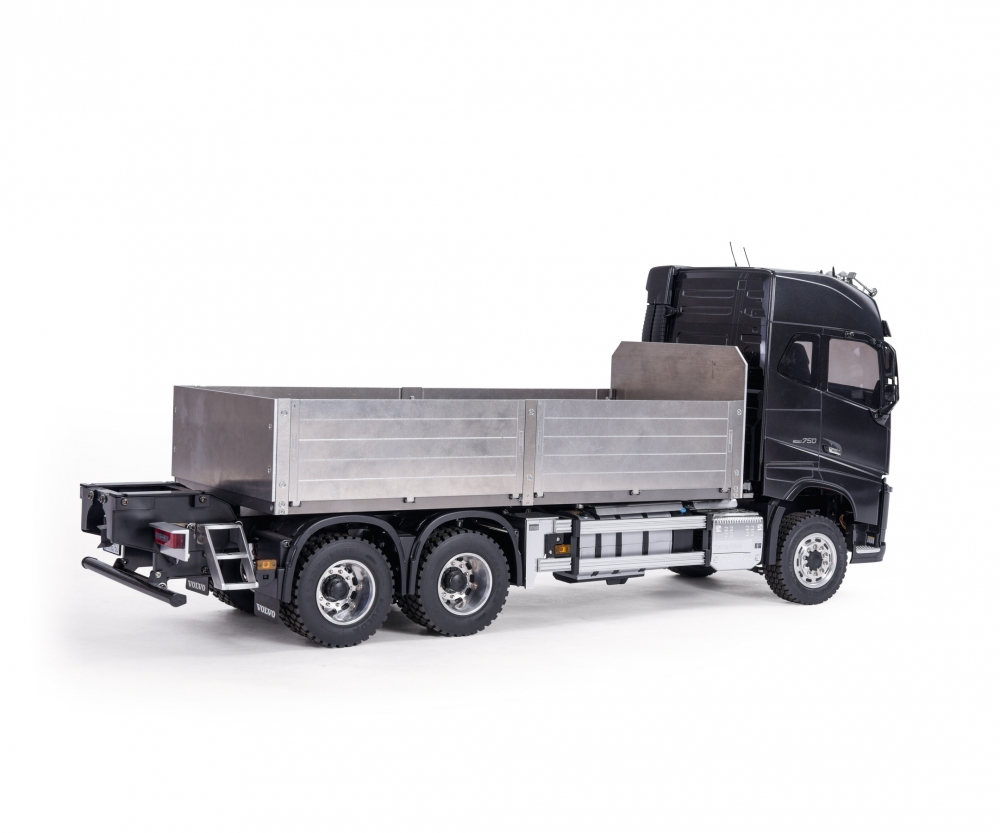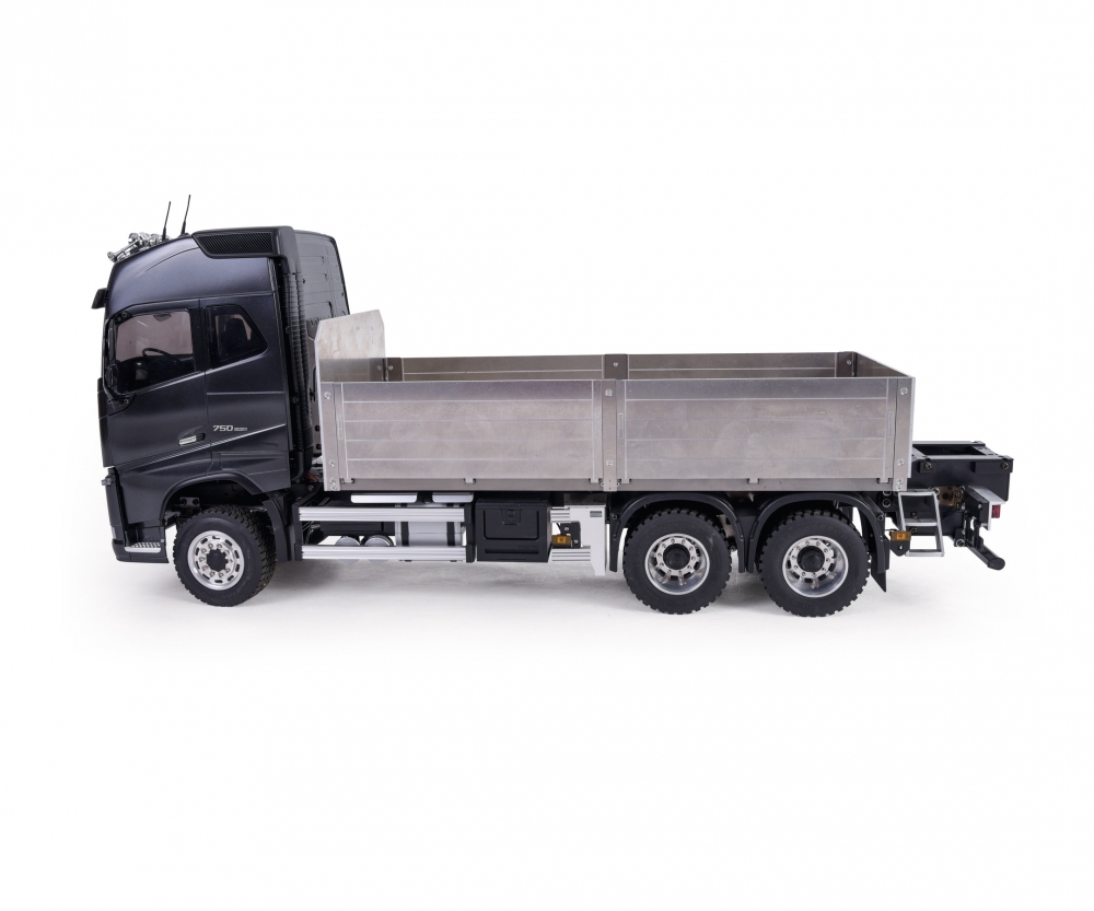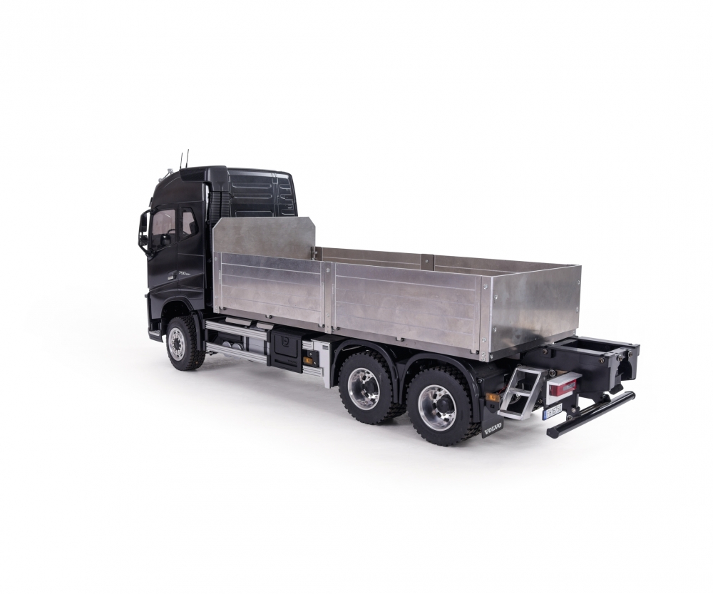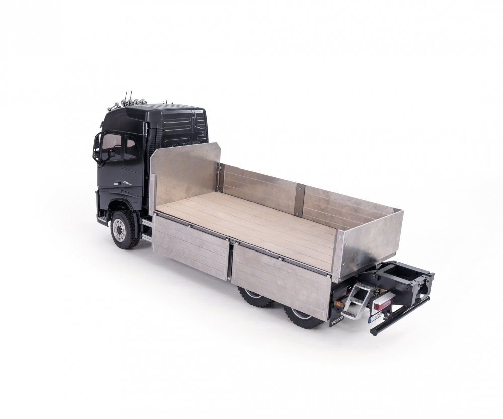 La base de cette structure de plateau est un cadre en acier avec un sous-châssis intégré pour le montage sur le châssis TAMIYA Volvo FH16. Les points de fixation/raccords à vis d'origine ont été utilisés pour le montage. Il n'est pas nécessaire de percer des trous manuellement. Les parois latérales détaillées comportent des gravures de surface des deux côtés et sont montées de manière mobile sur des charnières stables. Les parois latérales sont « verrouillées » à l’aide de puissants aimants en néodyme ; deux d’entre eux sont intégrés de manière presque invisible dans la paroi latérale. L'applique en bois incluse dans le kit de transformation souligne les détails de la structure du plateau et peut être vieillie et ajustée selon vos propres souhaits.