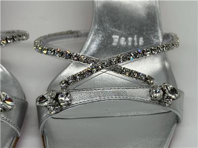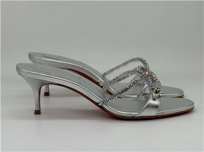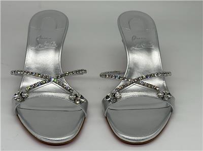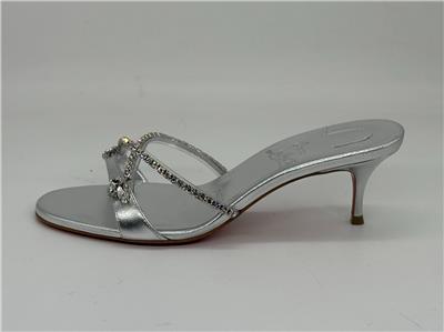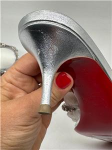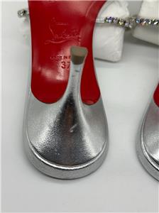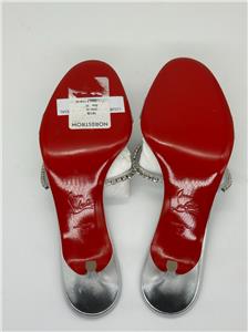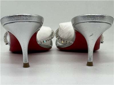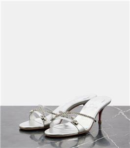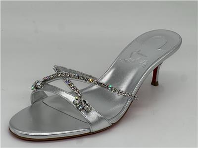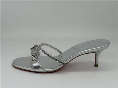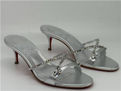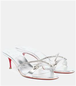 - Christian Louboutin's Iza Queen mules are perfect for making an entrance. Set on 55mm kitten heels and crafted from metallic nappa leather, the straps are traced with majestic crystals. The flash of red at the lacquered soles contrasts the silver beautifully.