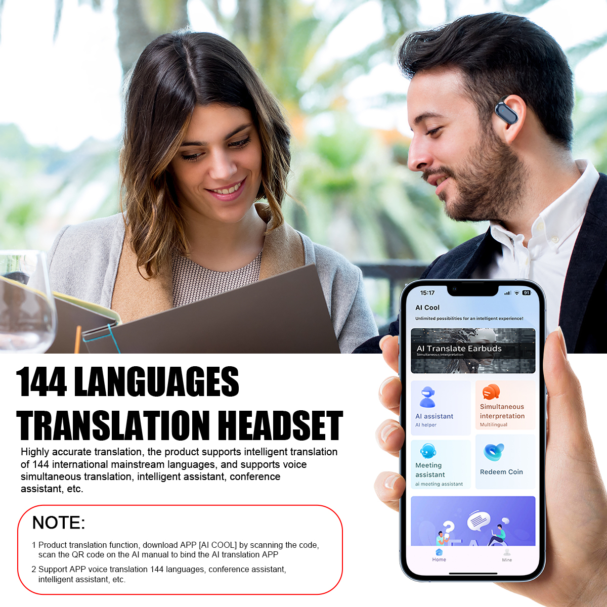 Product translation function, download the AI COOL app by scanning the QR code, and bind the AI translation app by scanning the QR code on the AI manual