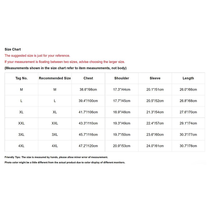 | Tag No. | Recommended Size | Chest | Shoulder | Sleeve | Length |