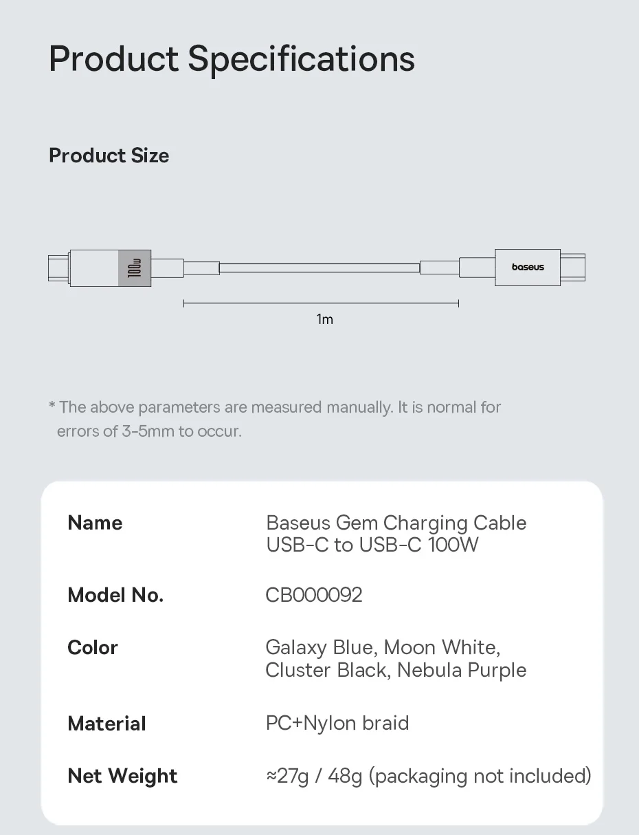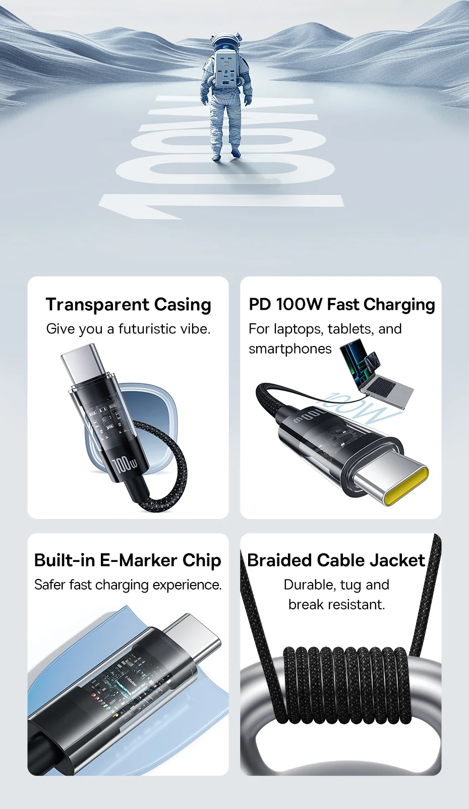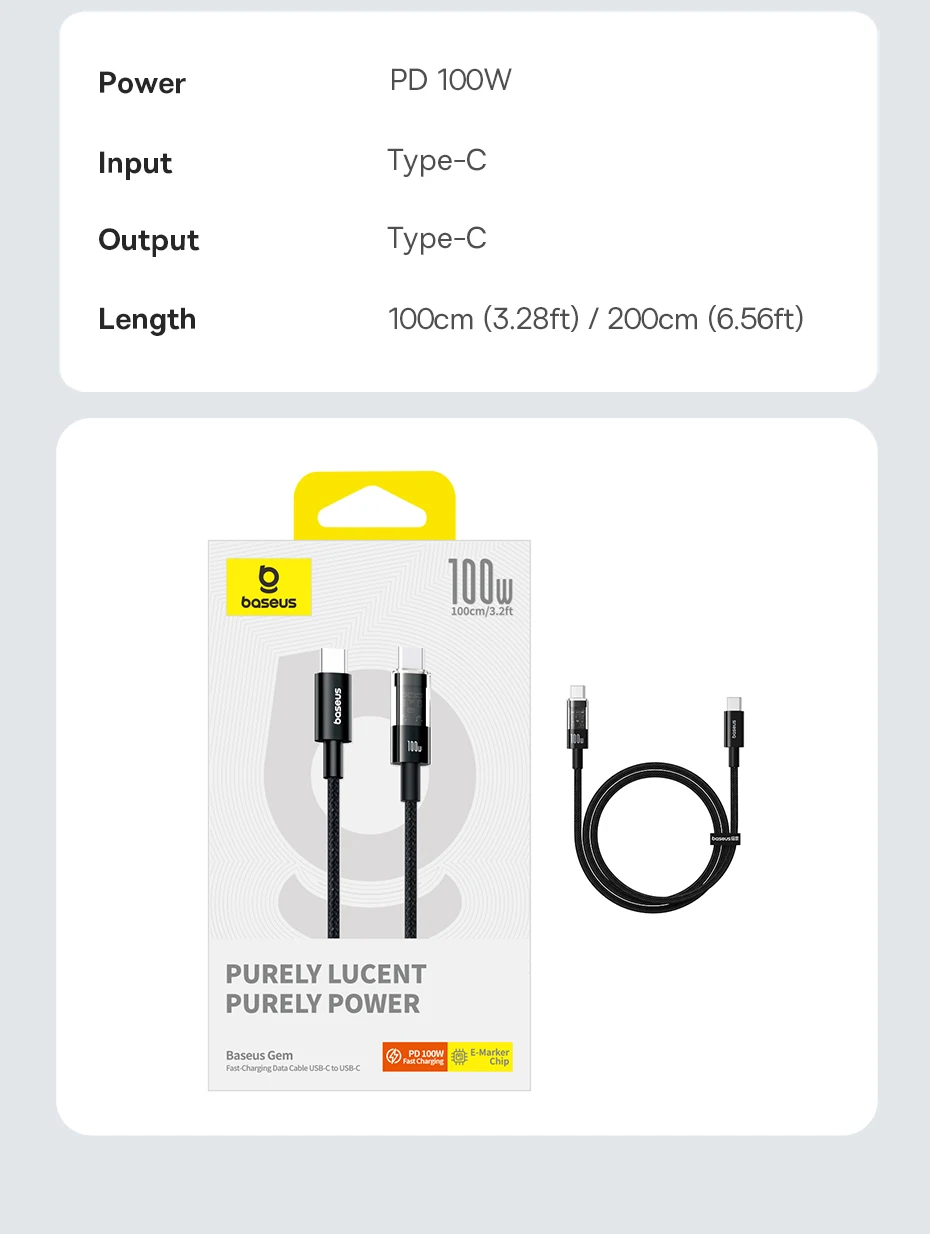 Câble de données de charge rapide transparent Baseus Type-c vers Type-c 100 W