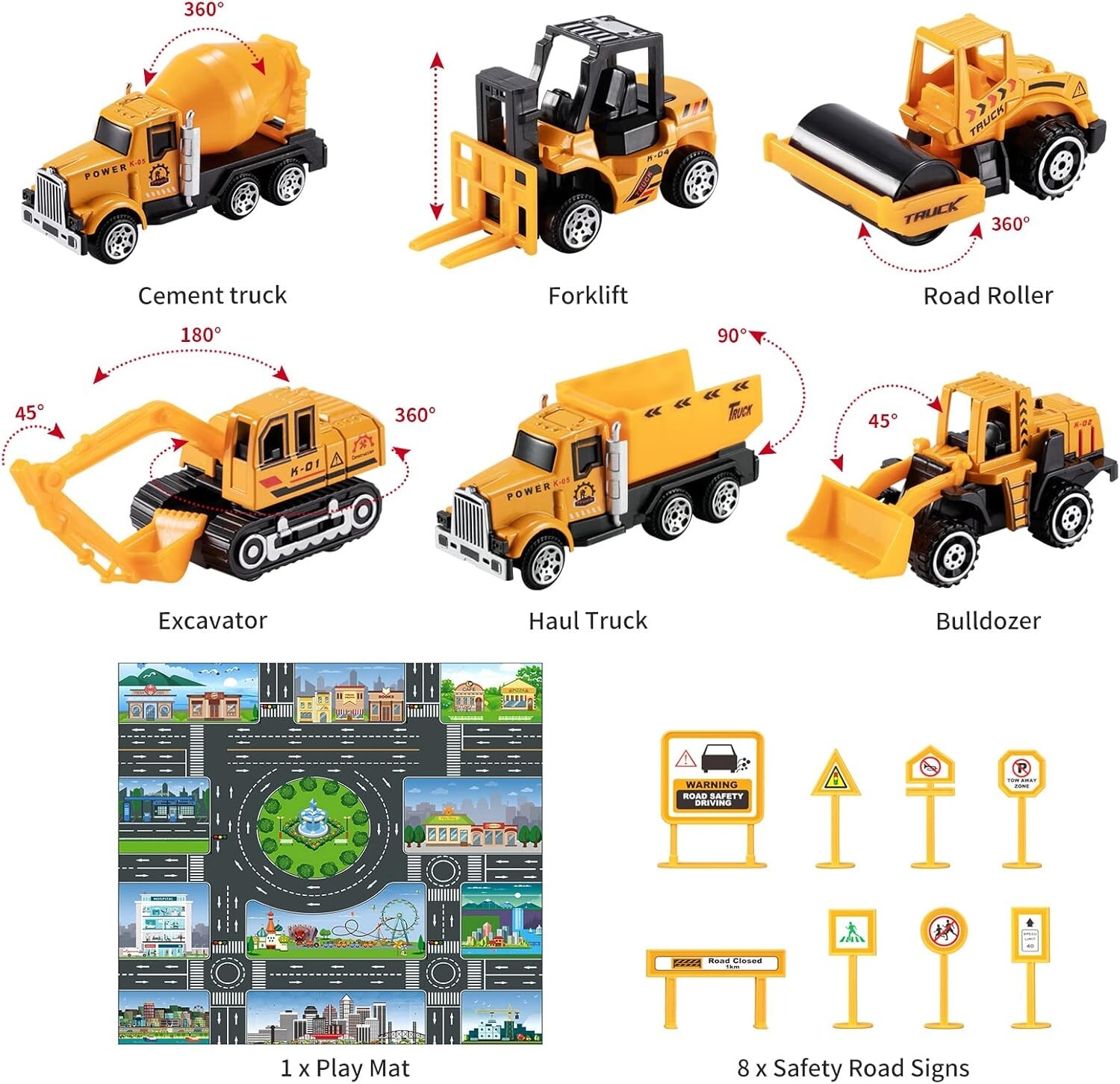 Multifunctional Construction Car Toys Set: Includes a foldable play mat, multi-function transport car, long cargo truck, forklift, bulldozer, road roller, excavator, cement truck, dump truck, and a set of interactive road signs.