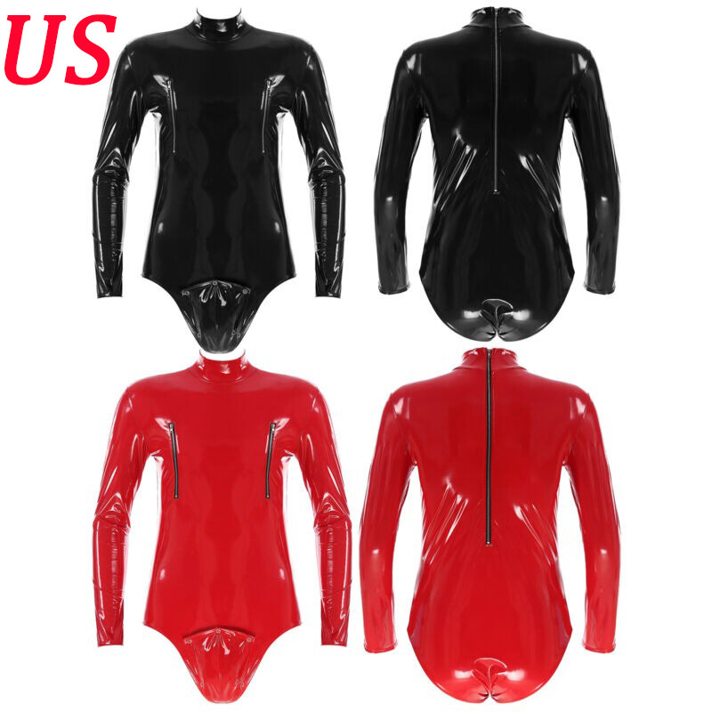 US Mens Bodysuit Wet Look PVC Catsuit Patent Leather Jumpsuit Underwear Clubwear