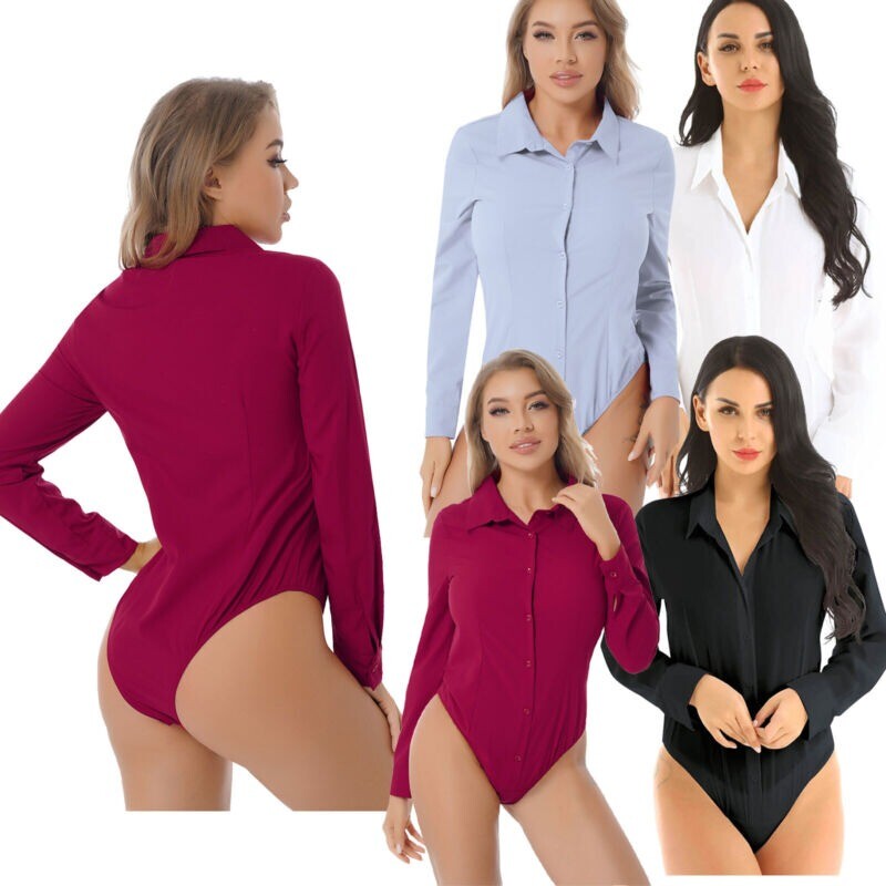 Women’s fashion one-piece solid color bodysuit shirts, front button closure.