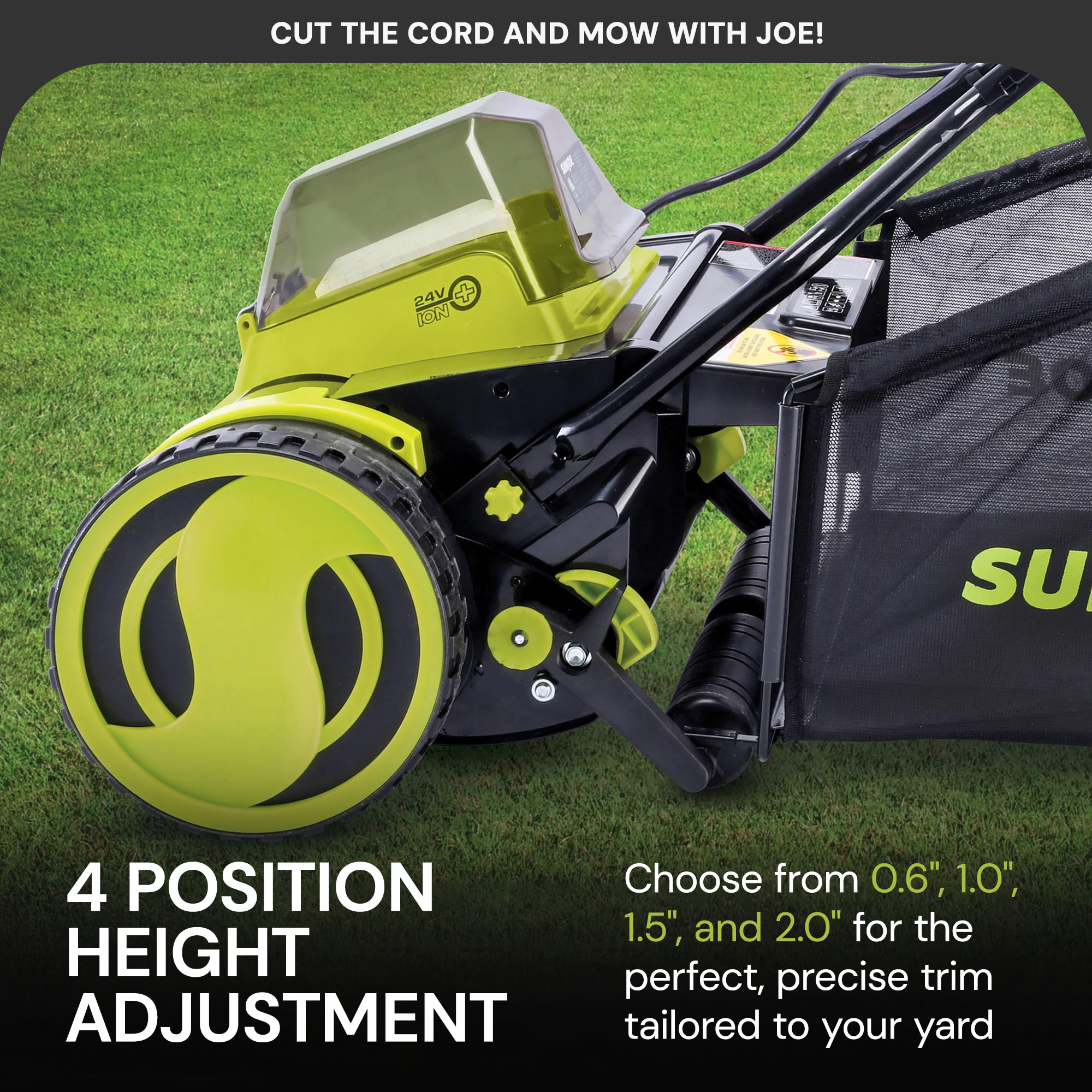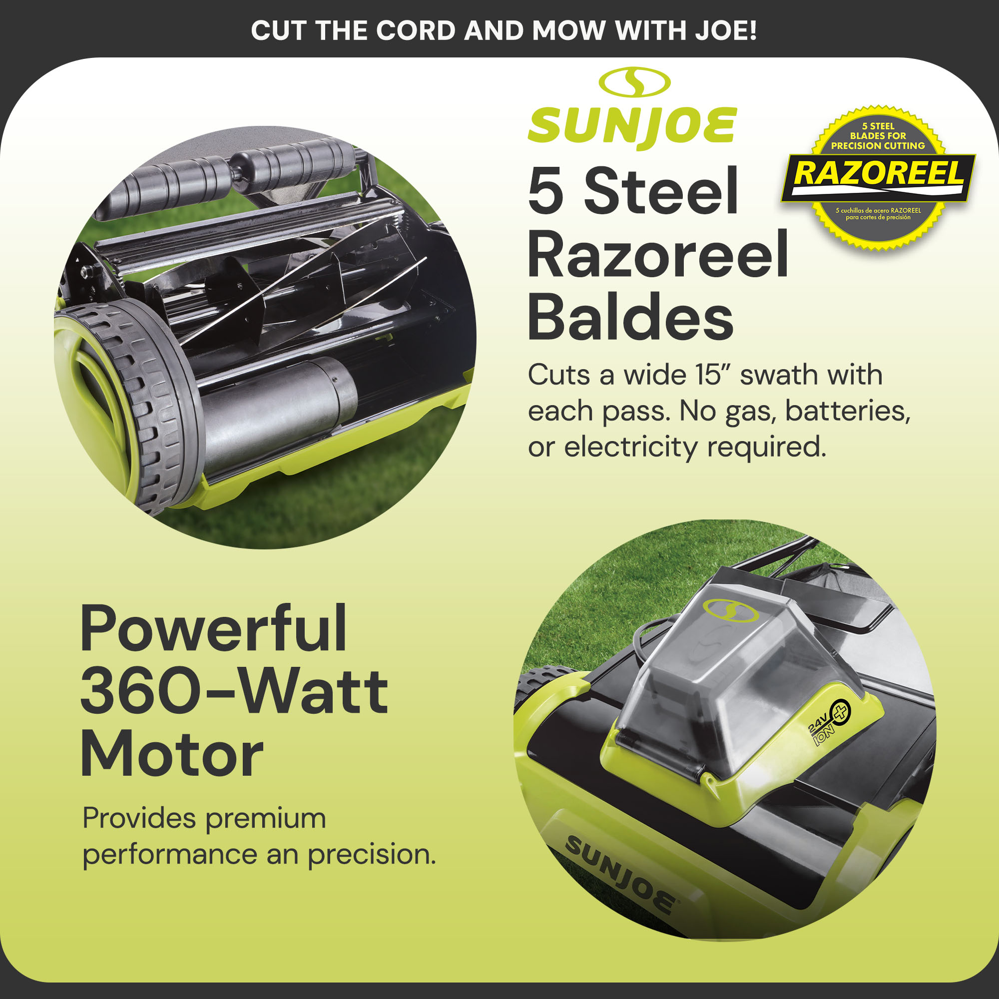 Sun Joe's 360 Watt motor is engineered for efficiency, providing you with maximum motor performance + cutting precision. The innovative 5-blade RAZOREEL rotor lifts and cuts each individual blade as you walk, clearing at 15-inch path in a single pass. Customize your cutting height with Sun Joe's 4-position manual height-adjustment lever — choose from 0.6", 1.0", 1.5", and 2.0" for the perfect, precise trim tailored to your yard. Plus, Sun Joe’s included 11.9 gallon grass-collection bag makes disposing of lawn clippings quick and easy. And when the work is done, simply plug the IONMAX battery back into the included Quick Charger and you're ready for the next mowing day.