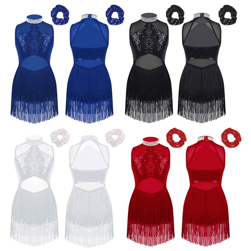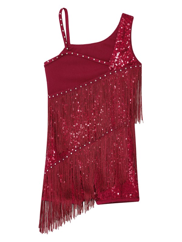 Hollow back, shiny sequins and rhinestone decorated, tassel straps outlook, boxer bottom hem, very fashionable.