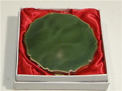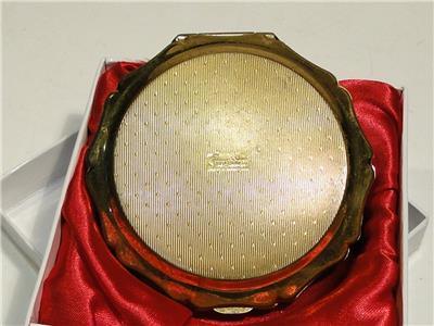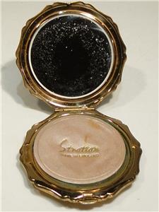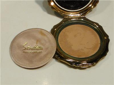 This is for a vintage Stratton made in England powder compact. The lid is green marbelized. Powder is still present inside. Very clean. There is a small dent. Being sold as vintage as shown to add to your collection.