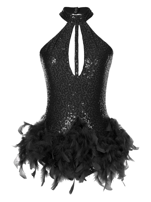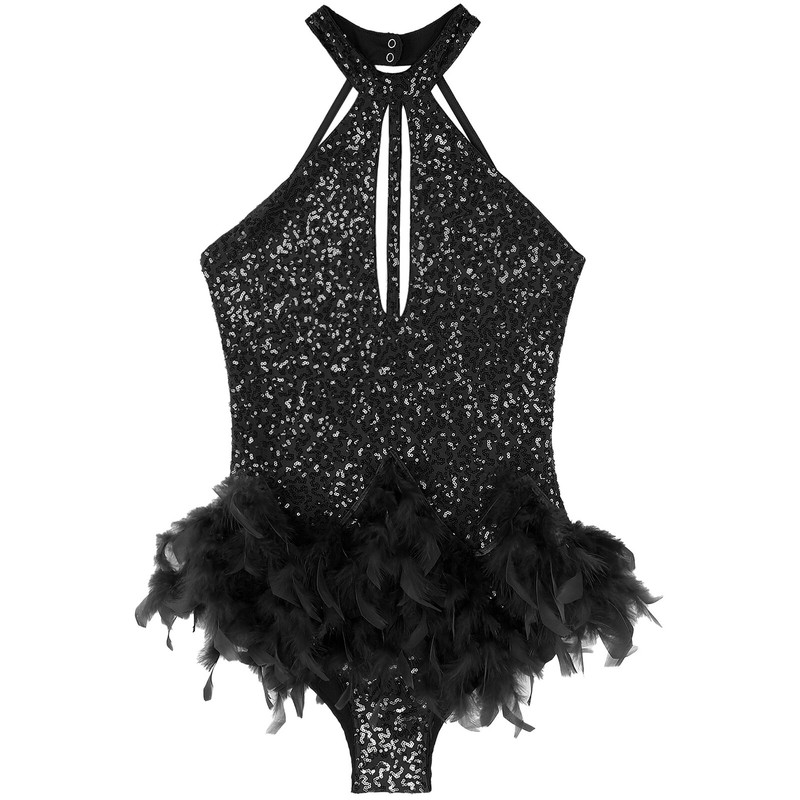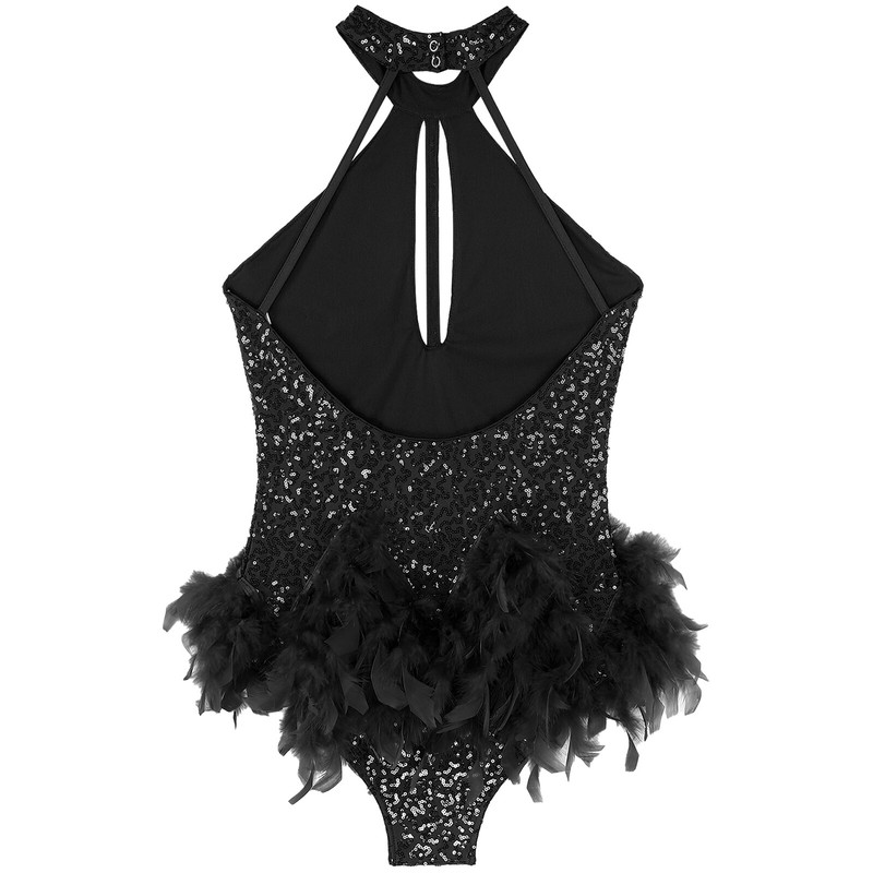 Glitzernder Tanzbody für Damen mit Pailletten und Federn an der Unterseite peppt jeden Auftritt auf und lässt Sie aus der Masse hervorstechen.