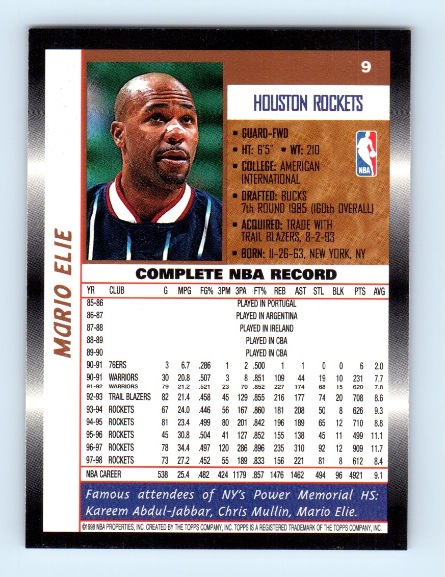 | 1998-99 Topps Mario Elie Houston Rockets #9 |