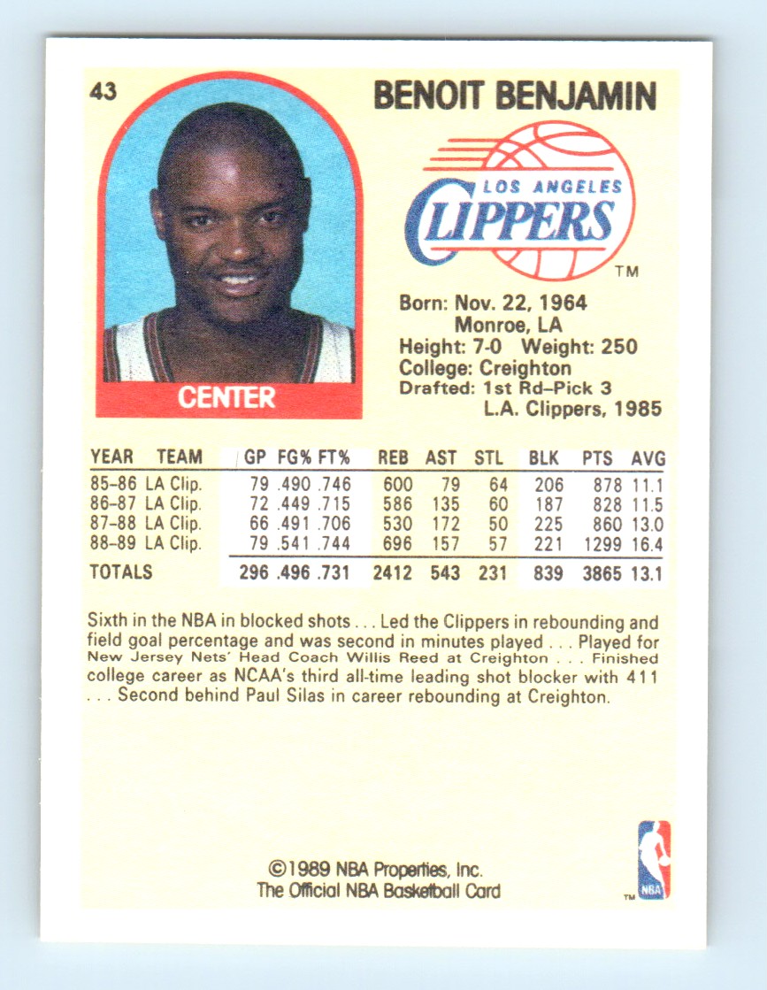 | Description: | Benoit Benjamin | | Category: | Basketball | | Year: | 1990 | | Product: | Hoops 100 Superstars | | Team: | Los Angeles Clippers | | Card Number: | 43 | | Dimensions: | 3½" x 2½" | | SKU: | BK BK0001 R04 M (22) |