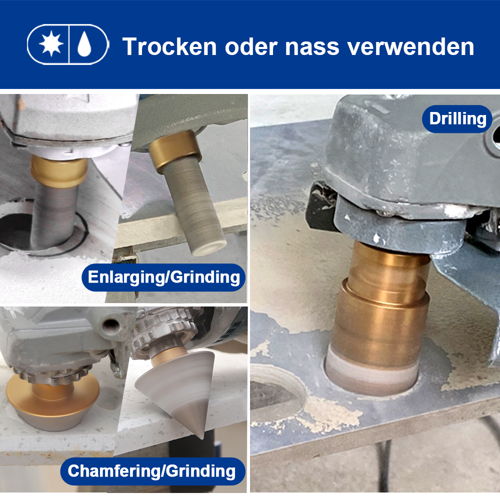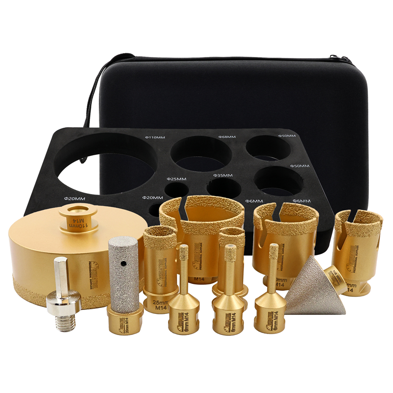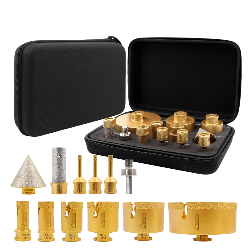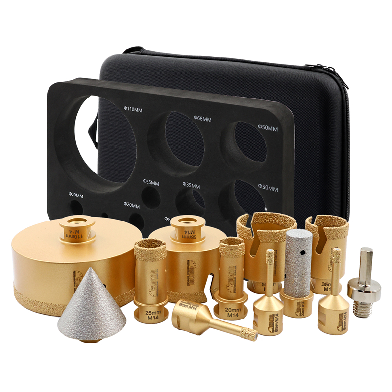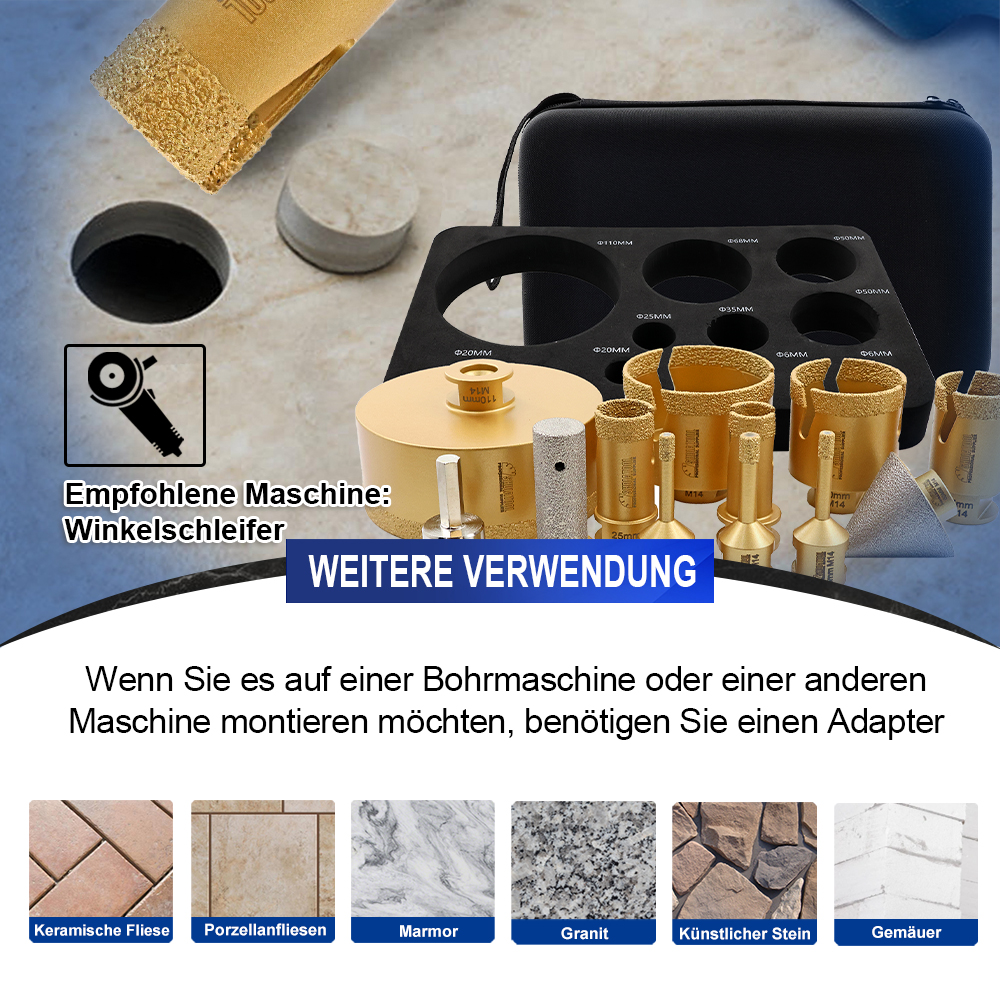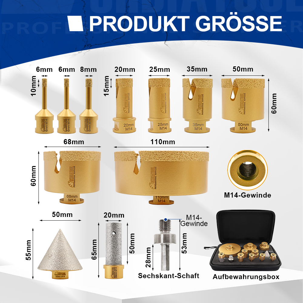 Artikel: SHDIATOOL Diamant-Bohr-Fräs-Bits Kit Menge: mit Aluminium-Box Kit 1: 30x19x8 M14 goldfarben gelötetes Loch bohren Blitzzähne 12 Löcher (6/6/8/20/25/35/50/68/110/20MM Schleifstab flach/2 "Fasenwerkzeug/HEX) Kit2: 21x16x7CM M14 goldfarben gelöteter Lochbohrer mit Blitzzahn 10 Löcher (6/6/8/25/35/50/68MM/10MM Schleifstab gebogen/2 "Kegelfase/HEX)-Lochbohrerhöhe 60MM Kit3: 21x16x7CM M14 goldgelöteter Lochbohrer mit Blitzzähnen 10 Löcher (6/6/8/25/35/50/68MM/10MM Schleifstabbogen/2 "Kegelfasegerät/HEX/115MM sechseckiges doppelseitiges Schneiden und schärfendes Sägeblatt)-Lochbohrer Höhe 60MM Kit4: 21x16x7CM M14 Goldgelötete Lochbohrer Blitzzähne 10 Löcher (6/6/8/10/35/50/68MM/25MM Bohrer Schleifstab Ein Stück/2 "Kegelfräser/HEX/SDS)-Lochbohrer Höhe 60MM Verwendung: Trocken-/Nassbohren für Fliesen, Granit, Marmor, Stein... Verkaufsargumente: 1、 [Modernste Verarbeitungstechnologie] Die Vakuumlöttechnologie bietet eine längere Lebensdauer; 2、【Weite Anwendung】Nass und trocken, umfassende Spezifikationen, breite Palette von Anwendungen, kann verschiedene Bedürfnisse erfüllen; 3、【Hochwertiges Rohmaterial】Unter Verwendung von hochwertigem Grundstahl und Diamant, kombiniert mit wissenschaftlichen Verhältnissen, um eine stetige Steigerung der Effizienz zu schaffen; 4、【Blitzzahndesign】5.8MM breites Blitzzahndesign, 20-30MM 2 Blitzzähne, 35MM und mehr 3 Blitzzähne; förderlich für Schutt und Wärmeableitung, bessere Leistung; 5、【Gutes Arbeitsfinish】Drill #35/40, schnelles und glattes Bohren, reduzieren Schutt, reduzieren Bruch, gutes Bohrfinish, sauber und glatt; Verkaufsargumente (Aluminiumbox) 1、【Frontier Verarbeitungstechnologie】Vakuumlöttechnologie bietet längere Lebensdauer; 2、【Breiter Anwendungsbereich】Nass und trocken, umfassende Spezifikationen, breite Palette von Anwendungen, kann verschiedene Bedürfnisse erfüllen; 3、【Hochwertiges Rohmaterial】Durch die Verwendung von hochwertigem Grundstahl und Diamant, kombiniert mit wissenschaftlichem Verhältnis, steigt die Effizienz stetig; 4、【Blitzzahndesign】5.8MM breites Blitzzahndesign, 20-30MM 2 Blitzzähne, 35MM und mehr 3 Blitzzähne; erleichtern Schutt und Wärmeableitung, bessere Leistung; 5、【Wax plug design】6-10MM plug Kühlwachs, spielen die Rolle der Kühlschmierung; 6、【Gutes Arbeitsfinish】Bohrer #35/40, schnelles und glattes Bohren, reduzieren Schutt, reduzieren Bruch, gutes Bohrfinish, sauber und glatt; 7、【Multifunktion】Bohren, Schleifen, Reiben, Anfasen von einem Satz, um die Bedürfnisse einer Vielzahl von Lochverarbeitung zu erfüllen 8、【Portables Design】Einfach zu tragen im Aluminiumkoffer mit Griffen 9、【Multi-size】Multi-Größen-Bohrer, um die Bedürfnisse der verschiedenen Löcher zu erfüllen 10、【Mit Adapterdesign】Mit Sechskantschaftadapter für Winkelschleifer und Handbohrer. Hinweise zum Gebrauch: 1、Nass und trocken verwenden 2、Anwendbare Maschine: Winkelschleifer 3, Verwenden Sie den Schlagmodus nicht, wenn Sie zu einem Gerät mit Schlagmodus wechseln; 4, Verwenden Sie den Saugnapf-Locator, um die Bohrposition genau zu lokalisieren, oder setzen Sie den Bohrer in einem 45-Grad-Winkel an und bohren Sie in einer kreisförmigen Bewegung, bis der Bohrer beginnt, in das Material einzudringen, dann heben Sie den Bohrer in die vertikale Position und fahren Sie fort; /25MM Bohrer-Schärfstab Ein Stück/2" Kegelfräser/HEX/SDS)-Lochbohrer Höhe 60MM