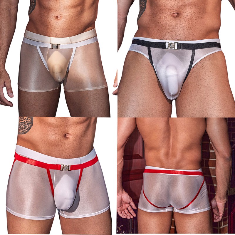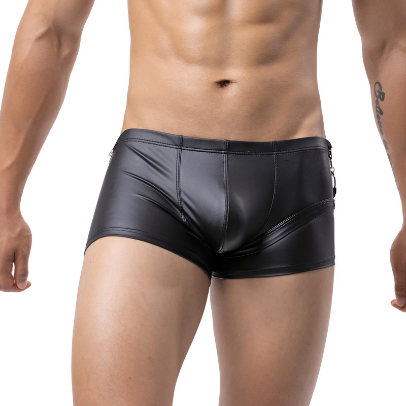 Low-waisted design with glossy appearance, this underwear with bugle pouch for private part.