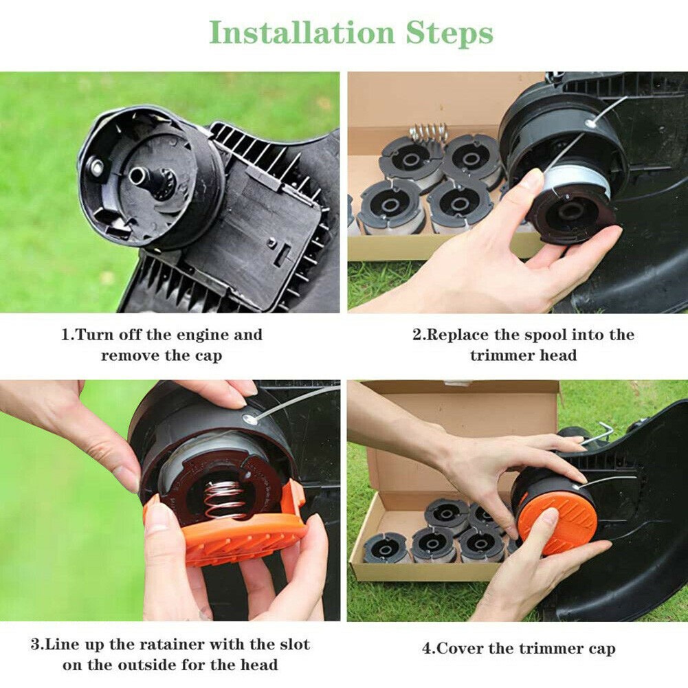 Facile à utiliser : facile et rapide, insérez la bobine dans la tête de , puis installez le ressort et le couvercle orange sur la tondeuse.