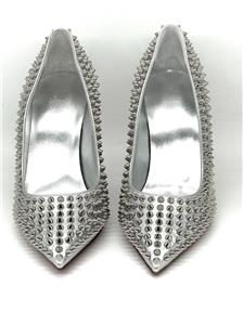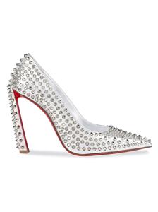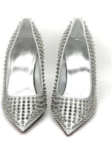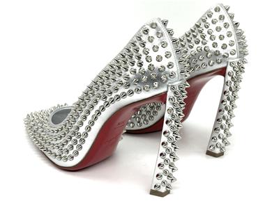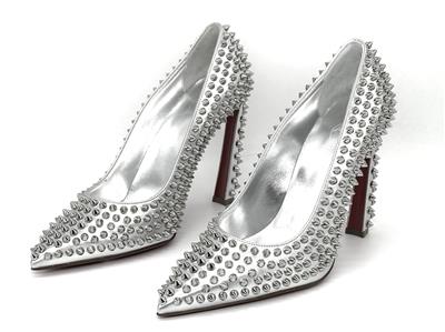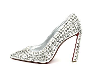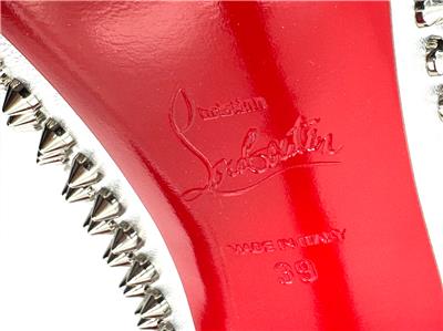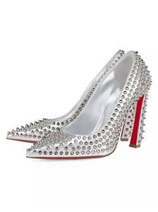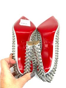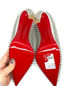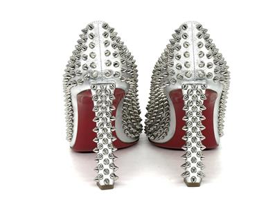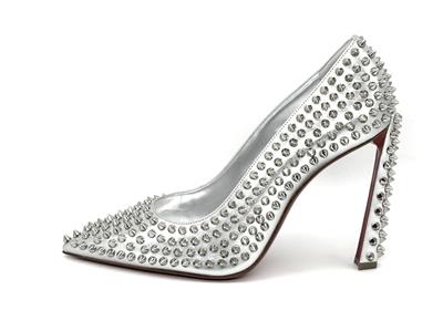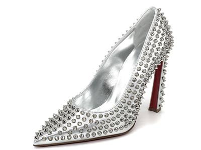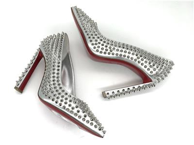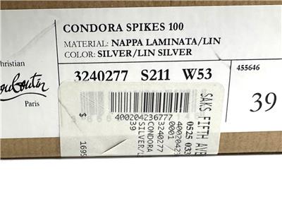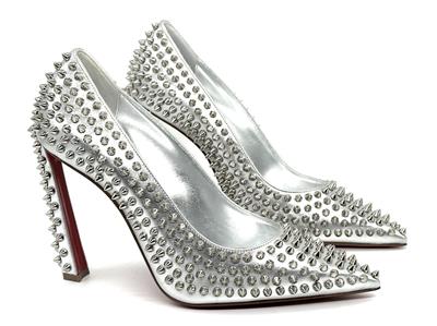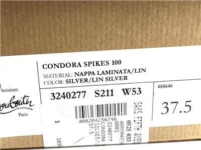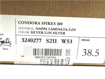 This sophisticated pump in metallic leather features a 100 mm angled heel and is adorned with Christian Louboutin's signature silvertone spikes. The Condora Spikes pump has a pointed toe like a bird's beak. They've been crafted in Italy from nappa leather and have a signature red leather outsole.