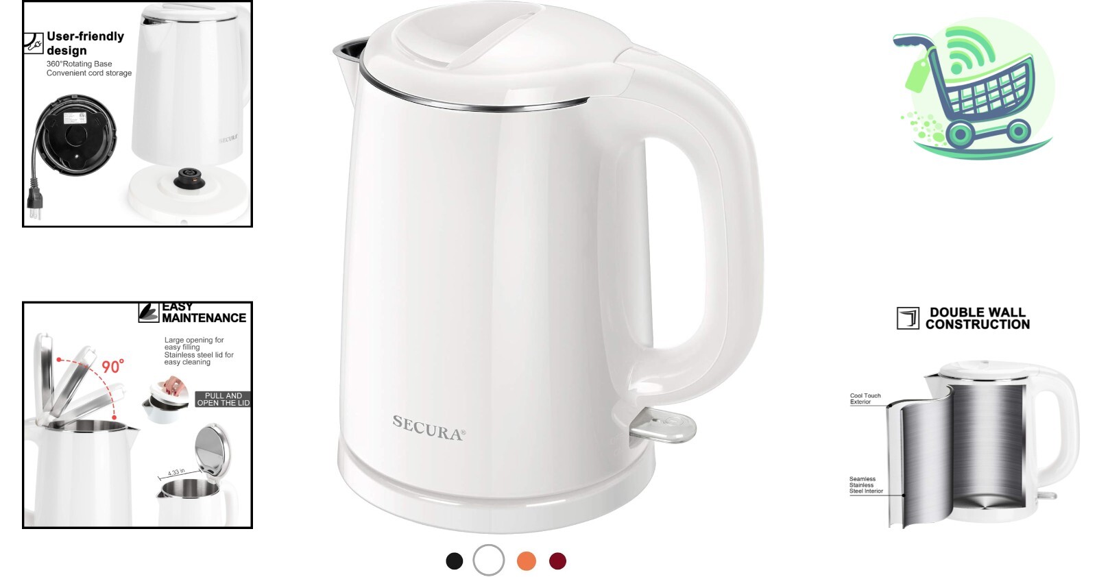 Features: Auto Shut-off,BPA Free,Boil-Dry Protection,100% stainless steel interior,Cordless design,30-inch power cord,Double-wall construction,BPA-Free cool touch exterior,British Strix control,ETL approved
